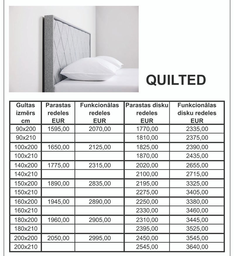 Klasiska dizaina gulta ar polsterētu rāmi, ērtu divdaļīgu galvgali. Īpaši izturīga gultas konstrukcija – pastiprināta ar metāla rāmi. Augstas kvalitātes vācu pneimatiskie rāmju pacēlāji. Uz augšu paceļama blīva ortopēdiska matrača redele. Gultu var izvēlēties ar vai bez veļas kastes.