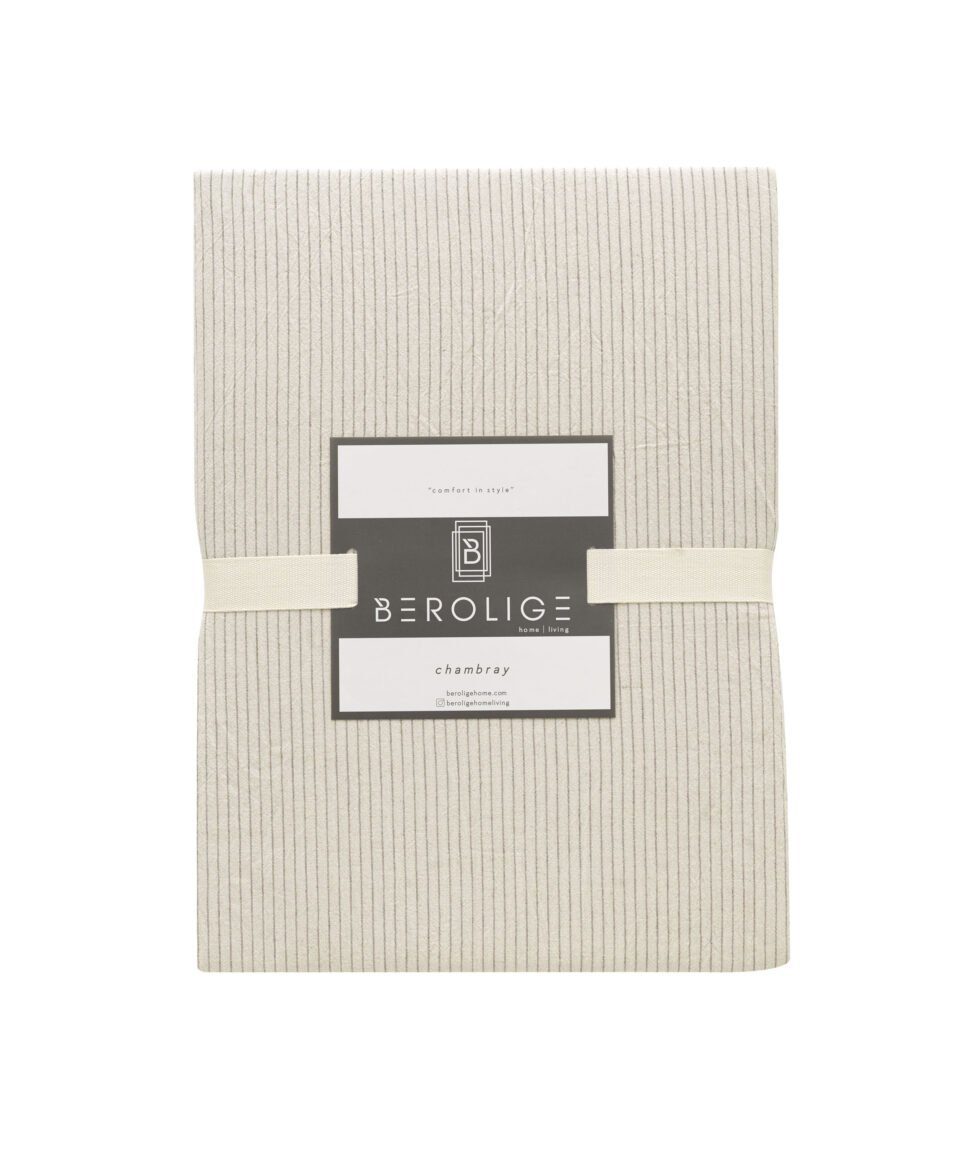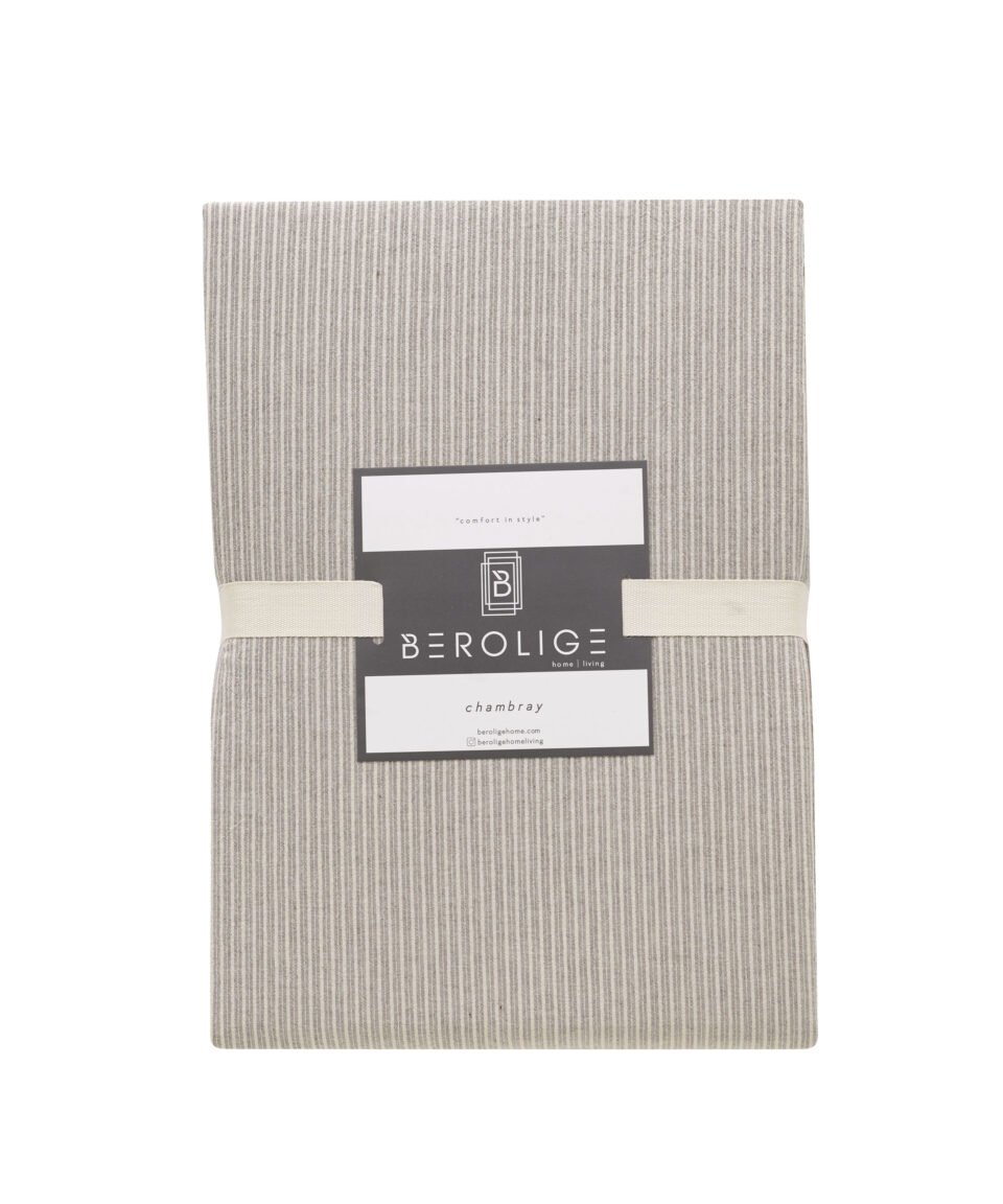 Kokvilnas gultas komplekts gaiši pelēcīgi bēšām un silti baltas krāsas svītrām, kas imitē tradicionālo svītraino kreklu rakstu. Palags ir vienkrāsains, gaiši pelēkā krāsā.