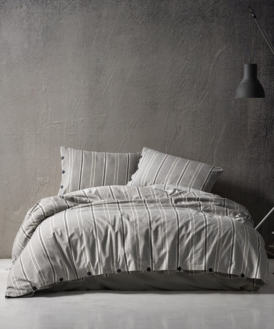Spilvendrānas no kokvilnas auduma ar gaiši pelēkas un silti baltas krāsas svītrām, kas atgādina tradicionālo svītraino kreklu rakstu, aizdare ar dekoratīvām, tumšām pogām.