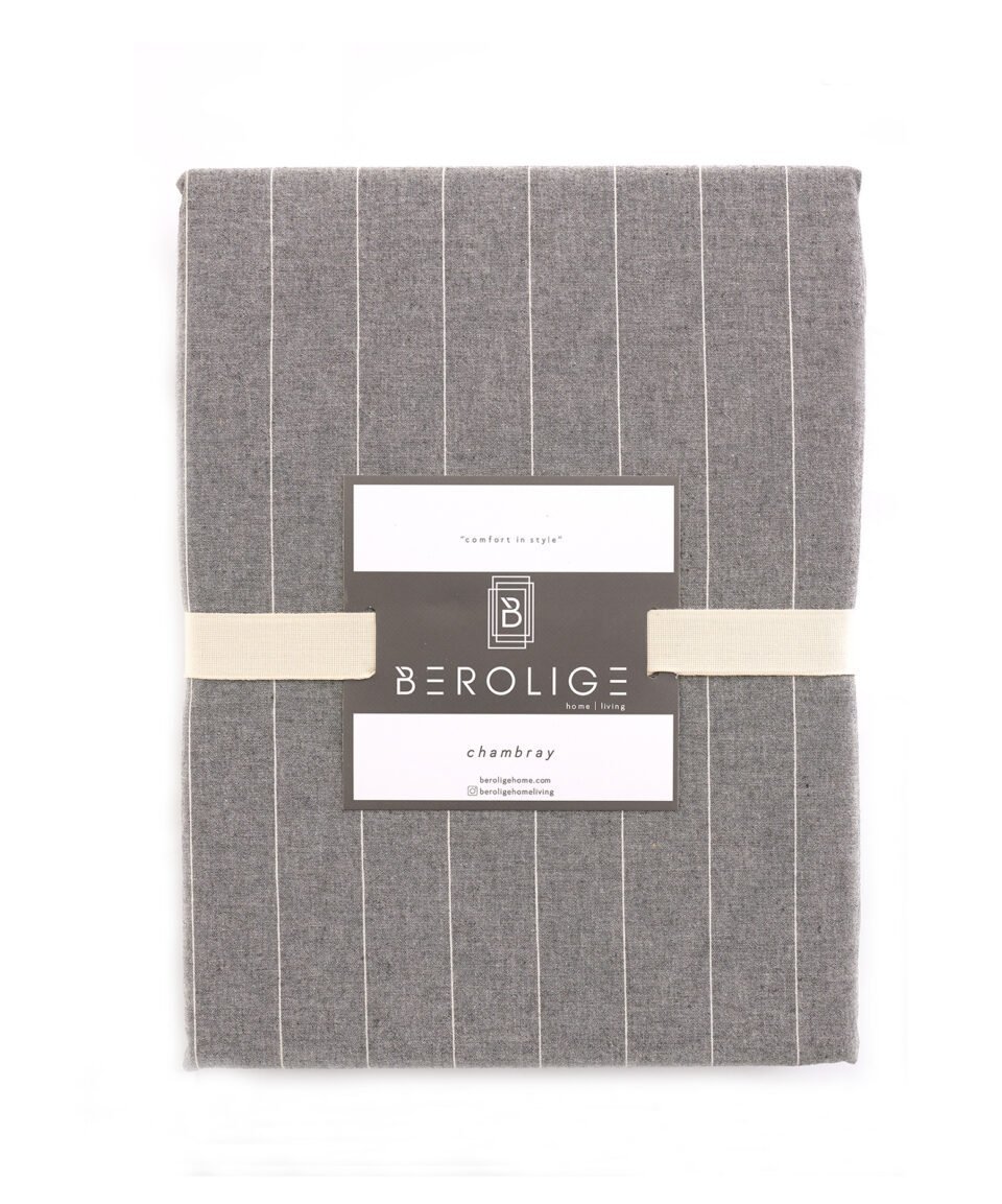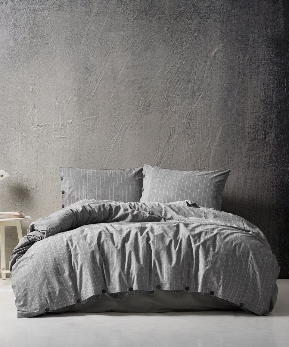 Kokvilnas gultas komplekts ar gaiši pelēkas un silti baltas krāsas svītrām, kas atgādina tradicionālo svītraino kreklu rakstu. Palags ir vienkrāsains, gaiši pelēkā krāsā.
