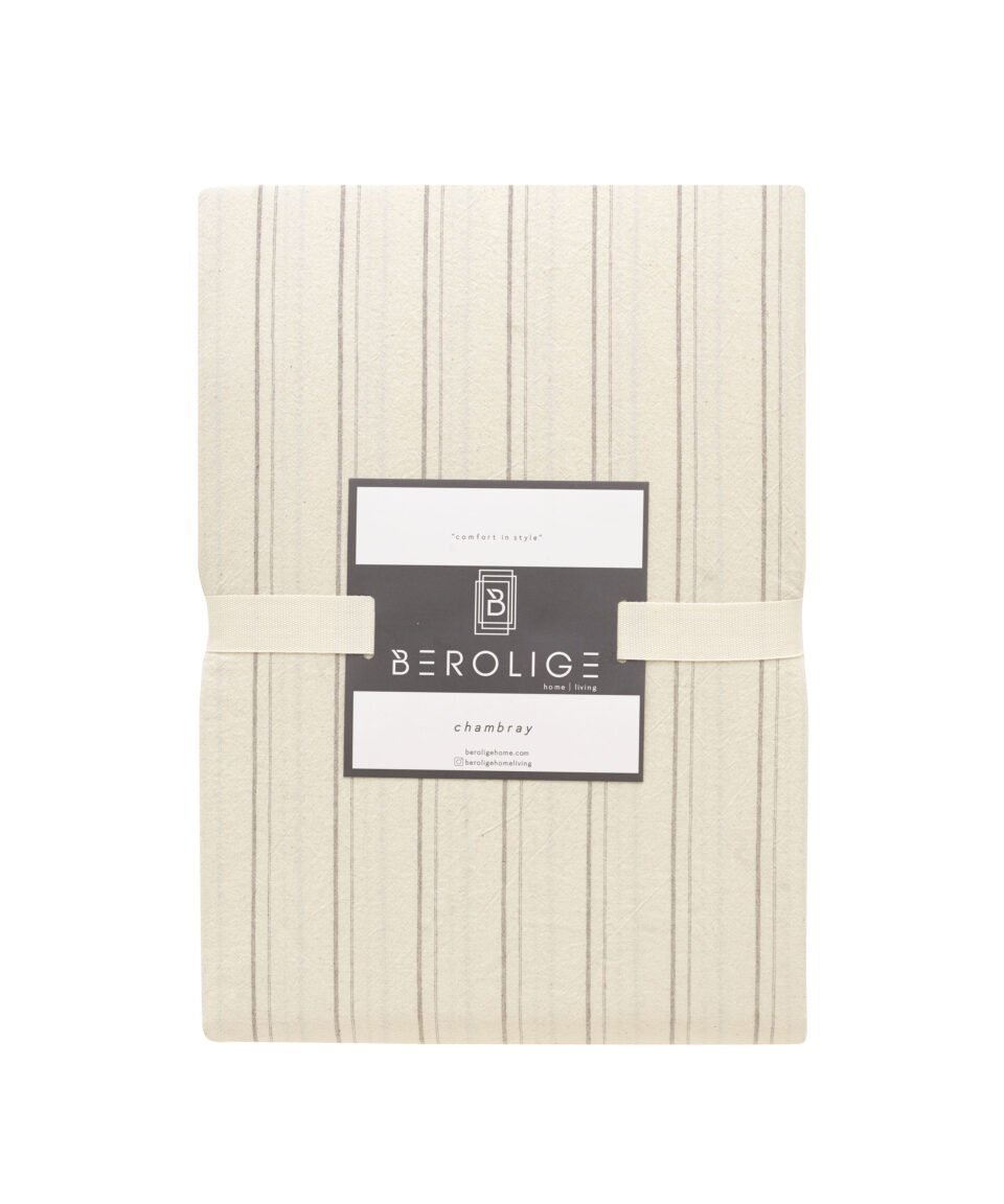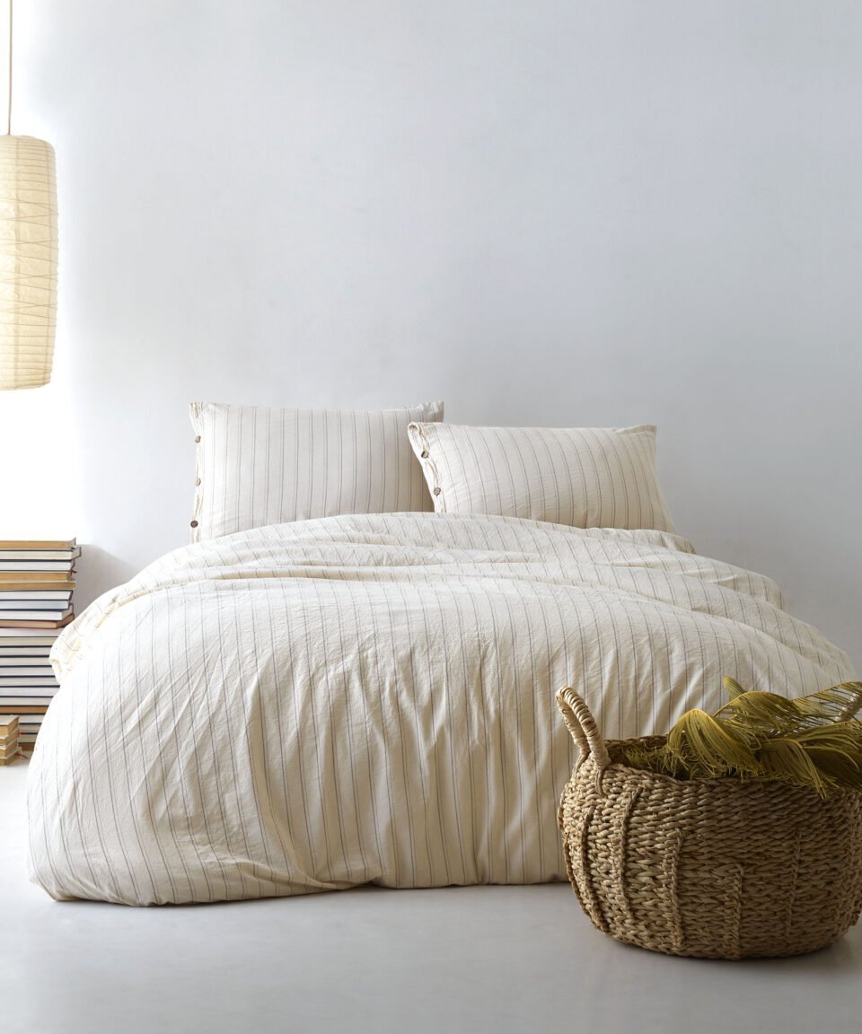 Kokvilnas gultas komplekts gaiši pelēcīgi bēšām un silti baltas krāsas svītrām, kas imitē tradicionālo svītraino kreklu rakstu. Palags ir vienkrāsains, gaiši pelēkā krāsā.