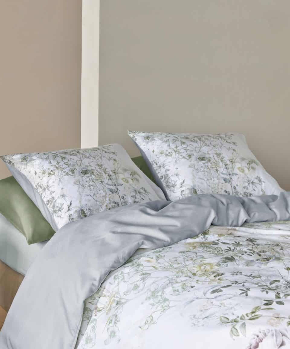 Kolekcija The Lovers Tale no maiga kokvilnas satīna. The Lovers Tale Moss pārvalka un spilvendrānas abas puses ir vienādas – ar zaļganu rakstu uz balta fona.