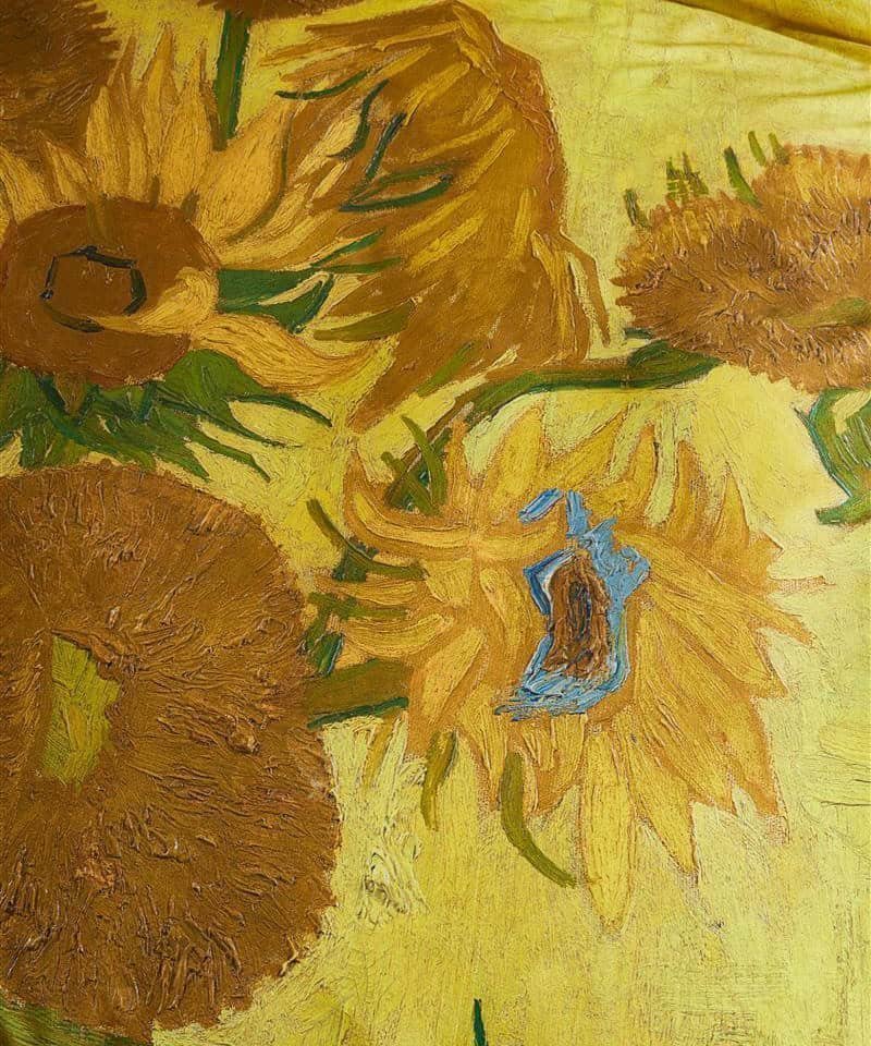 Komplekta dizains radīts saskaņā ar vienu no Vincenta van Goga slavenākās gleznas „Saulespuķes“ motīviem. Tā ir sulīga, dažādu dzelteno, oranžo un zaļo nokrāsu simfonija. Auduma apdrukas metode izvēlēta tā, lai rezultāts pēc iespējas vairāk atbilstu gleznojuma tehnikai, ar skaidri redzamiem otas triepieniem. Izteiksmīgie ziedi un kompozīcija piešķirs guļamistabai bagātīgu izskatu ar māksliniecisku pieskārienu. Segas pārvalka aizmugure ir vienkrāsaina. Pateicoties satīna aušanas veidam, audums ir vienreizēji mīksts un ar satīnam raksturīgu spīdumu.