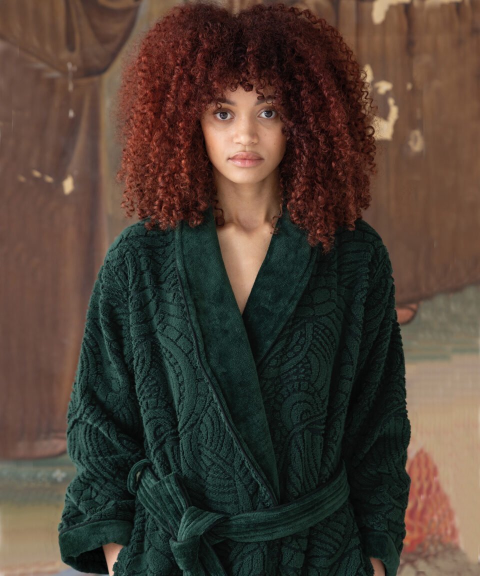 Tumši zaļas krāsas premium kvalitātes halāts. Iedvesmots no Maurīcijas salas lielākā izmirušā Dodo putna spalvu raksta, šis halāts izceļas ar unikālu žakarda rakstu, kas ieausts tieši auduma struktūrā – tas ir ne tikai raksts, bet arī sajūta.