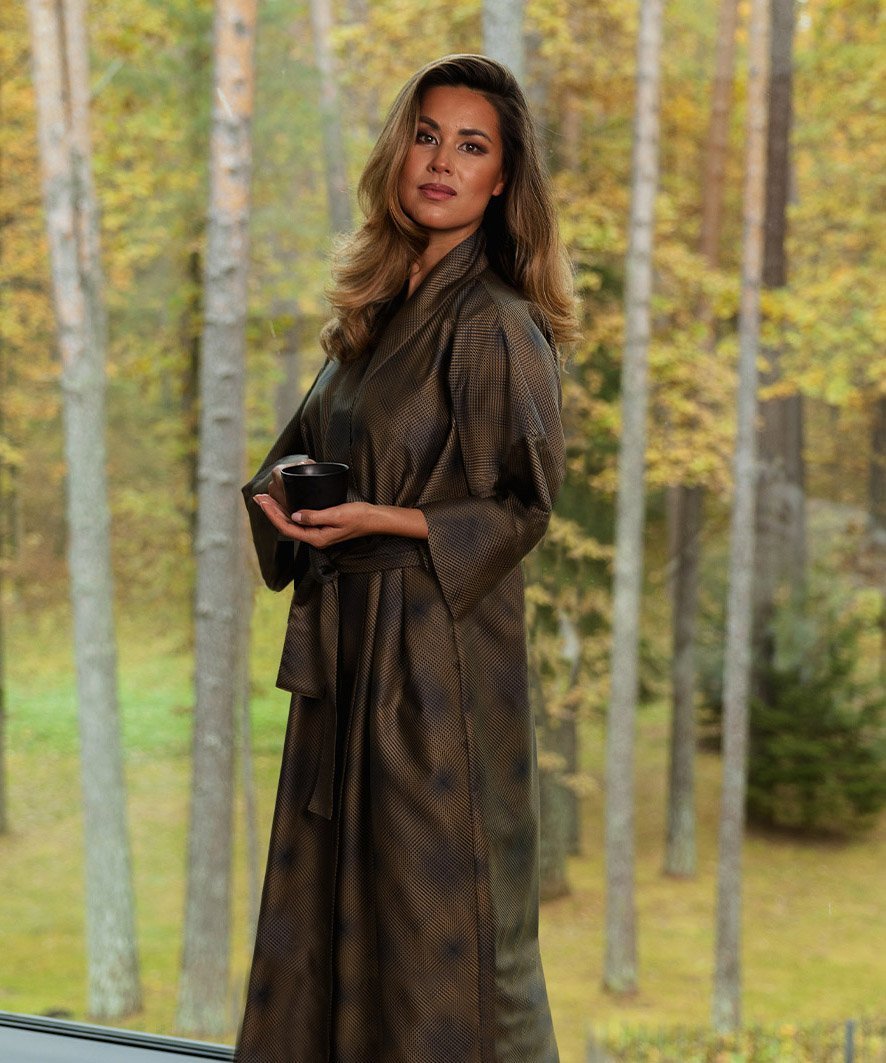 Pelēcīgi zaļas krāsas kokvilnas halāts Orion Iceland Moss ar maigu tekstūru un eleganta minimālisma rakstu paredzēts tiem, kam patīk smalkums un unikalitāte. Patīkams un mīksts kokvilnas audums, kas rada viegluma sajūtu.