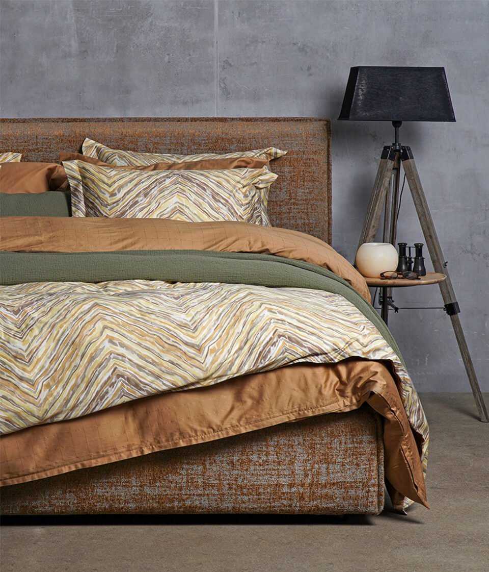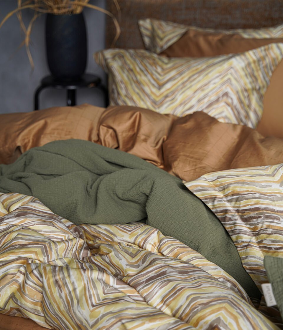 Simetrisks pasteļtoņu krāsu raksts radīs patīkamu sajūtu Jūsu guļamistabā. Šī gultas veļa lieliski piemērota klasiskam interjeram. Viena puse segas pārvalkam ir ar rakstu, otra-kanēļa krāsā (cinnamon).