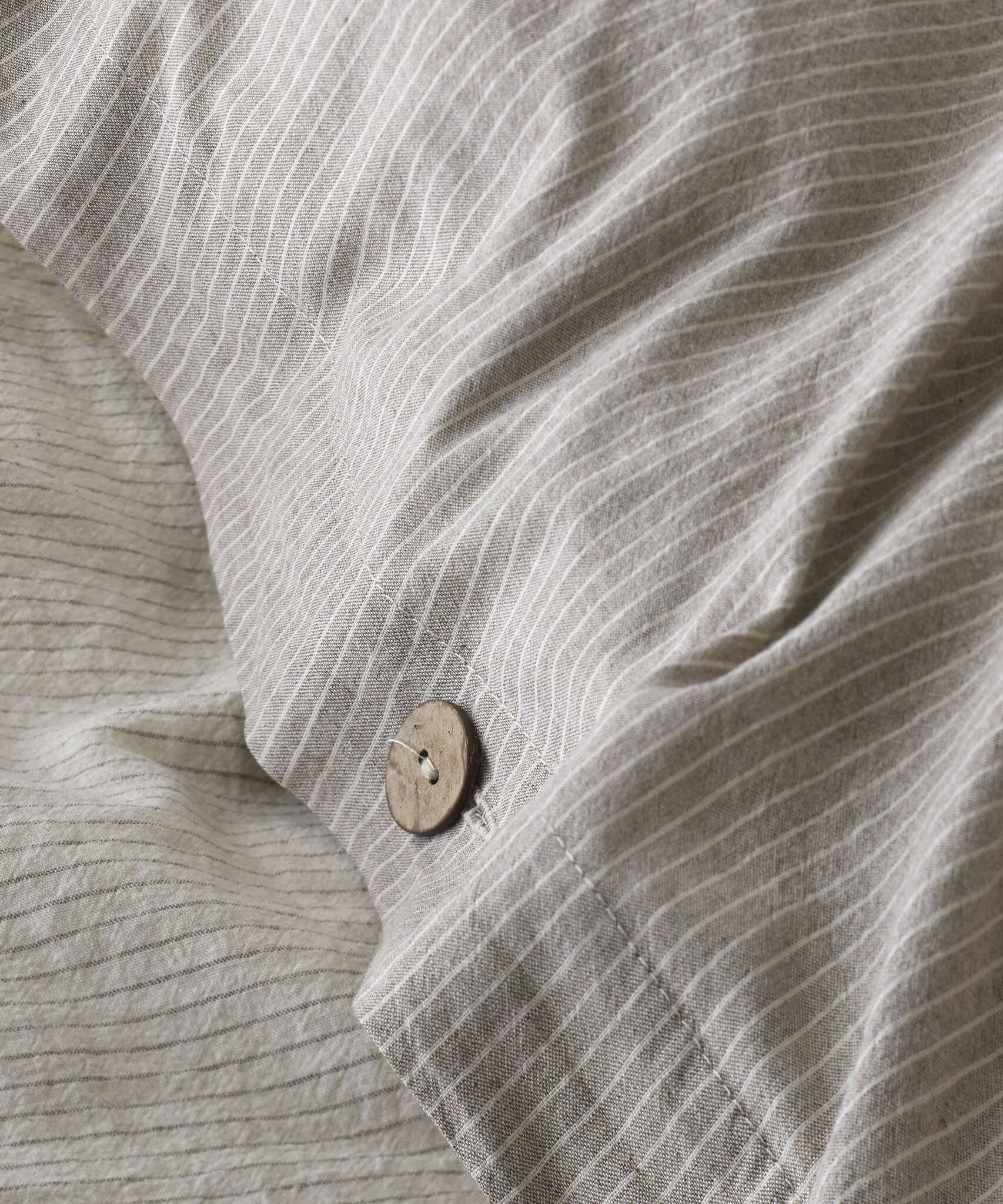 Spilvendrānas no kokvilnas auduma kakao krāsā ar silti baltas krāsas strīpām, aizdare ar dekoratīvām pogām.