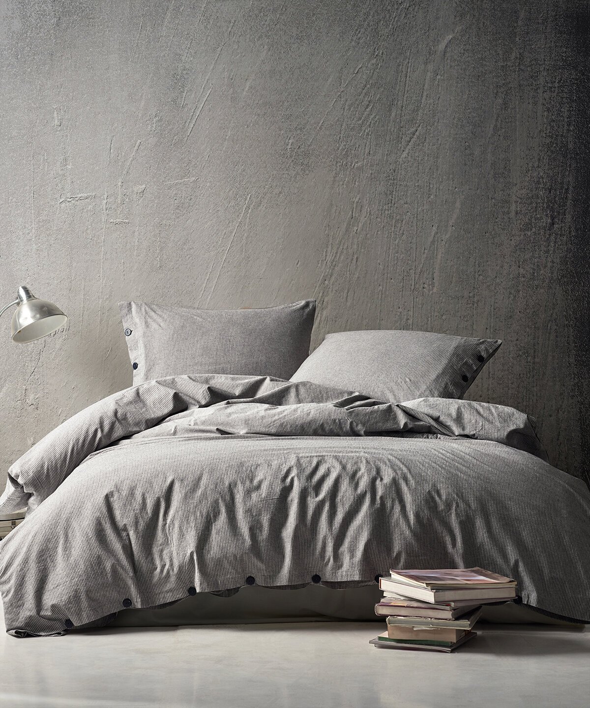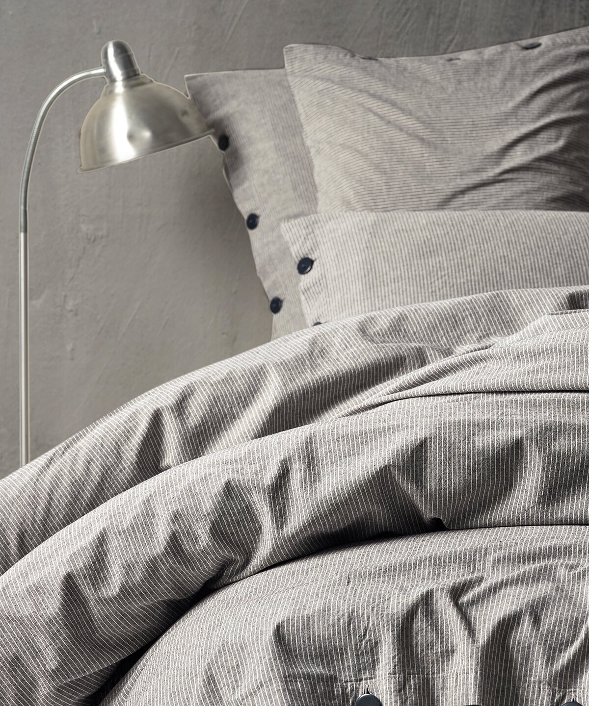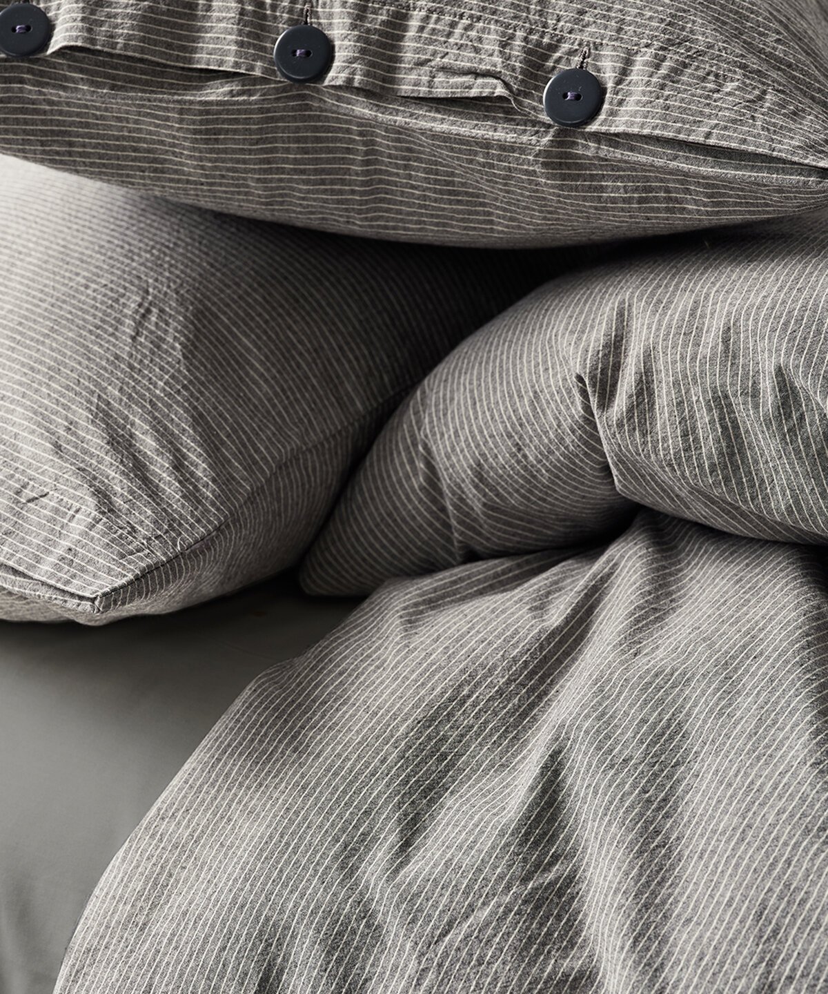 Segas pārvalka un spilvendrānas aizdare ar dekoratīvām, tumšām pogām.
