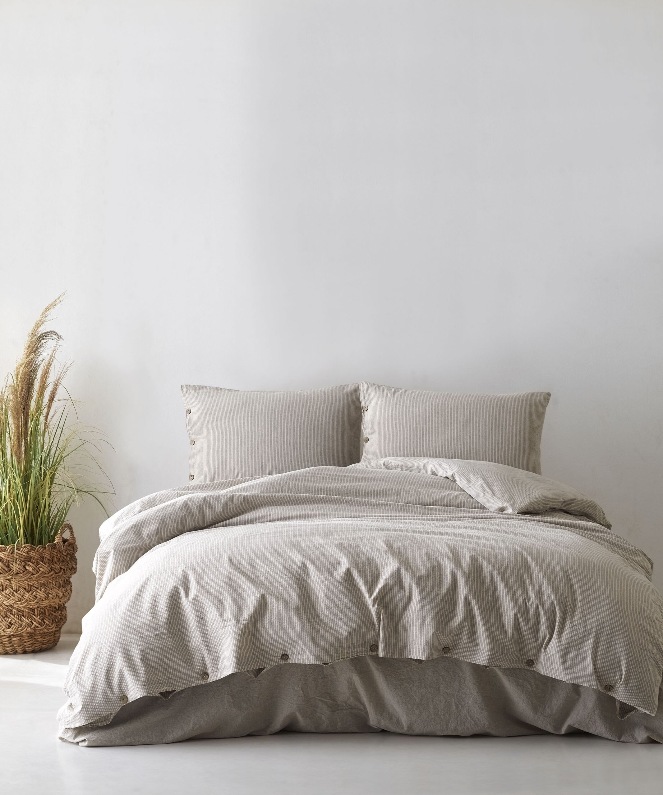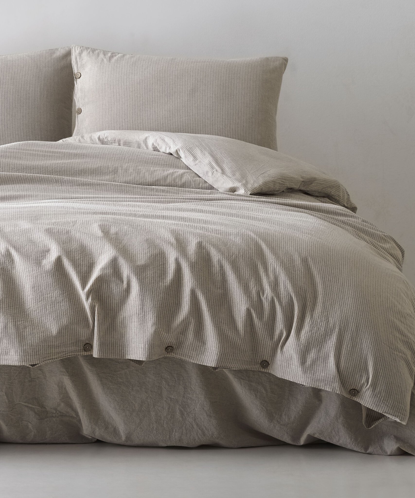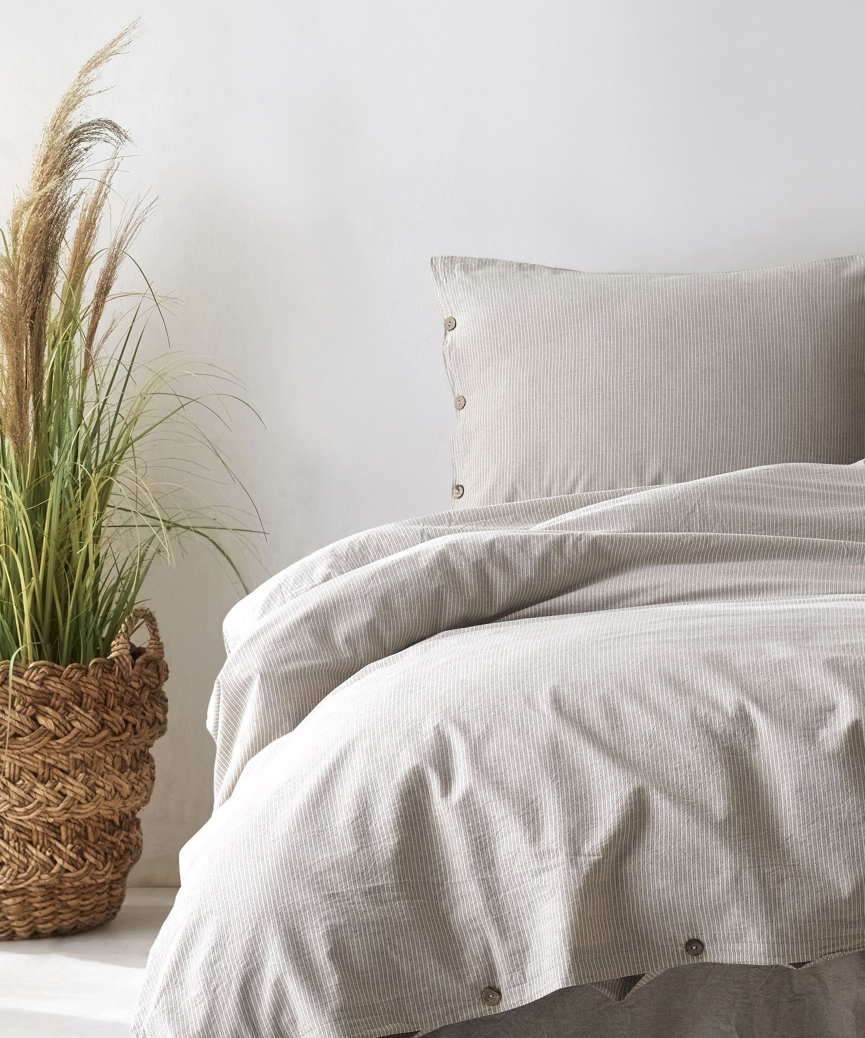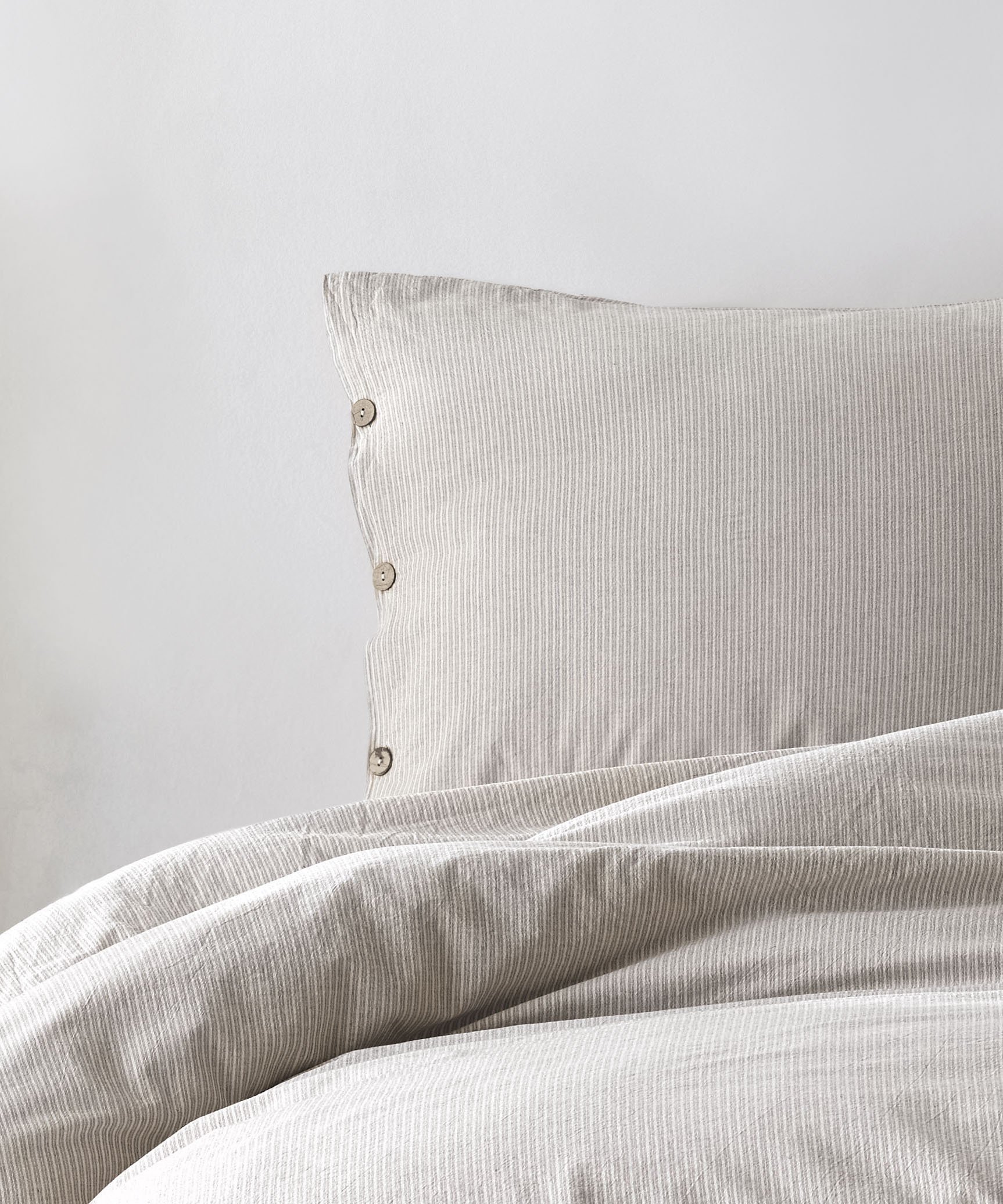 Spilvendrānas no kokvilnas auduma gaiši pelēcīgi bēšām un silti baltas krāsas svītrām, kas atgādina tradicionālo svītraino kreklu rakstu, aizdare ar dekoratīvām, tumšām pogām.