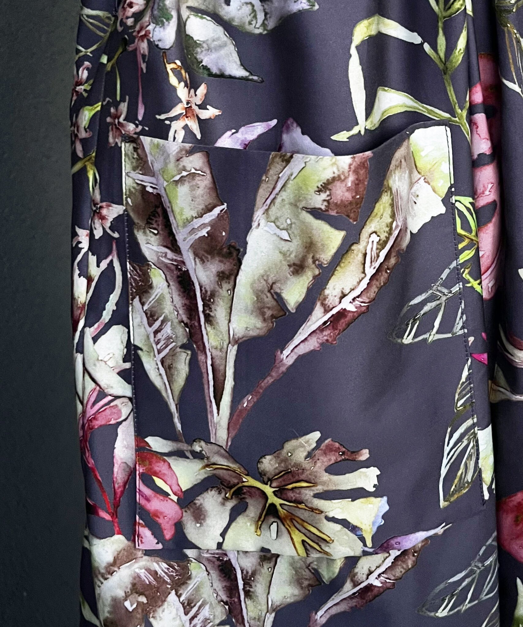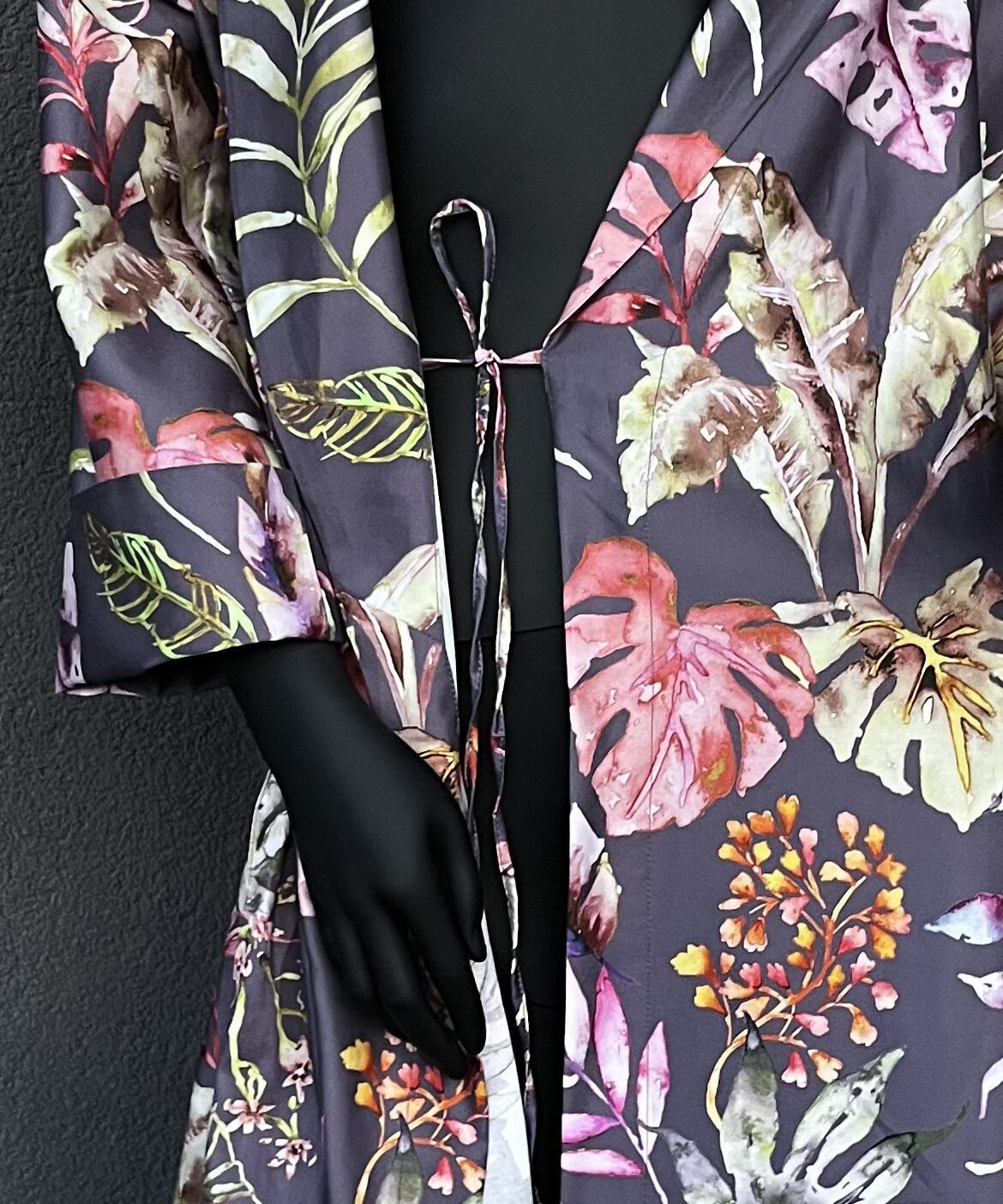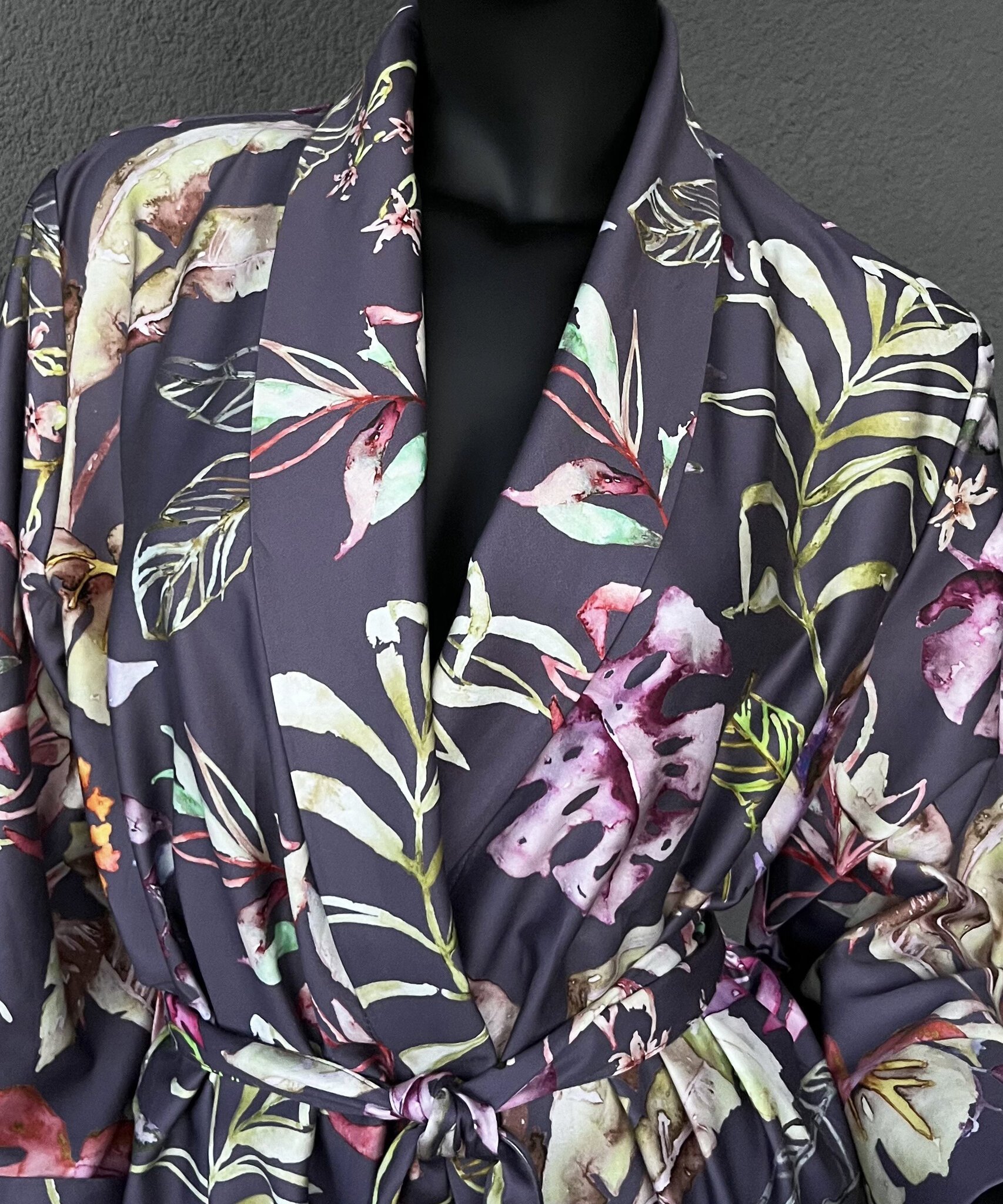 Halāts vīģes violetā krāsā ar krāšņu ziedu rakstu. Zīdaini maigs satīna audums, viegls un patīkams. Pieejami klasiska piegriezuma modeļi, ar jostu, divām uzšūtām kabatām, muguras augšējā daļā dubultu audumu un iekšpusē sasienamu papildus jostiņu.