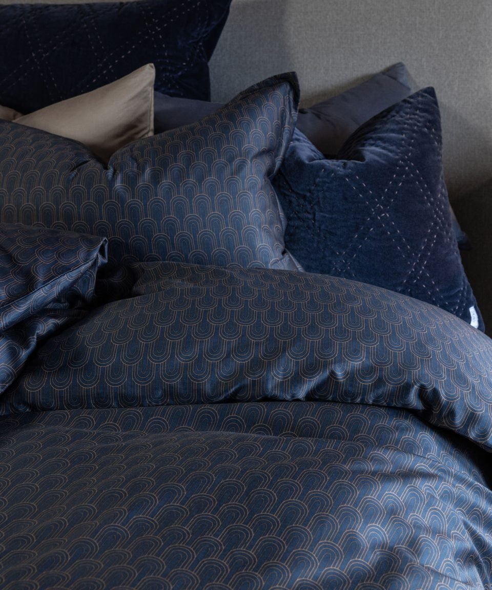 Betty Blue gultas veļas komplekts no maiga satīna auduma, tumši zilā krāsā, ar elegantu rakstu zeltainā tonī. Komplekts ar dizainu, kas guļamistabai piešķirs izsmalcinātu atmosfēru.