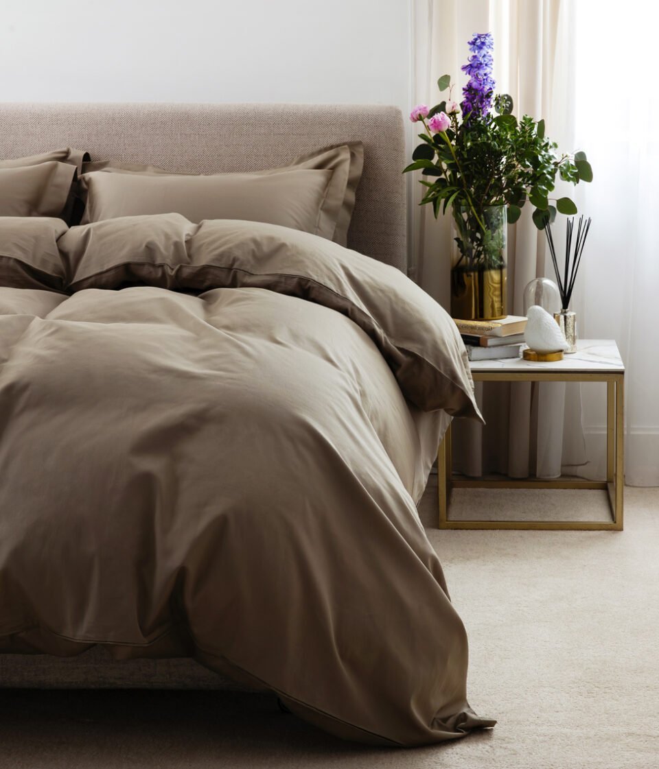 Pelēcīgi bēšas krāsas satīna gultas veļa guļamistabā ienesīs relaksācijas sajūtu. Lieliski piemērota gaišam, mūsdienīgam interjeram.