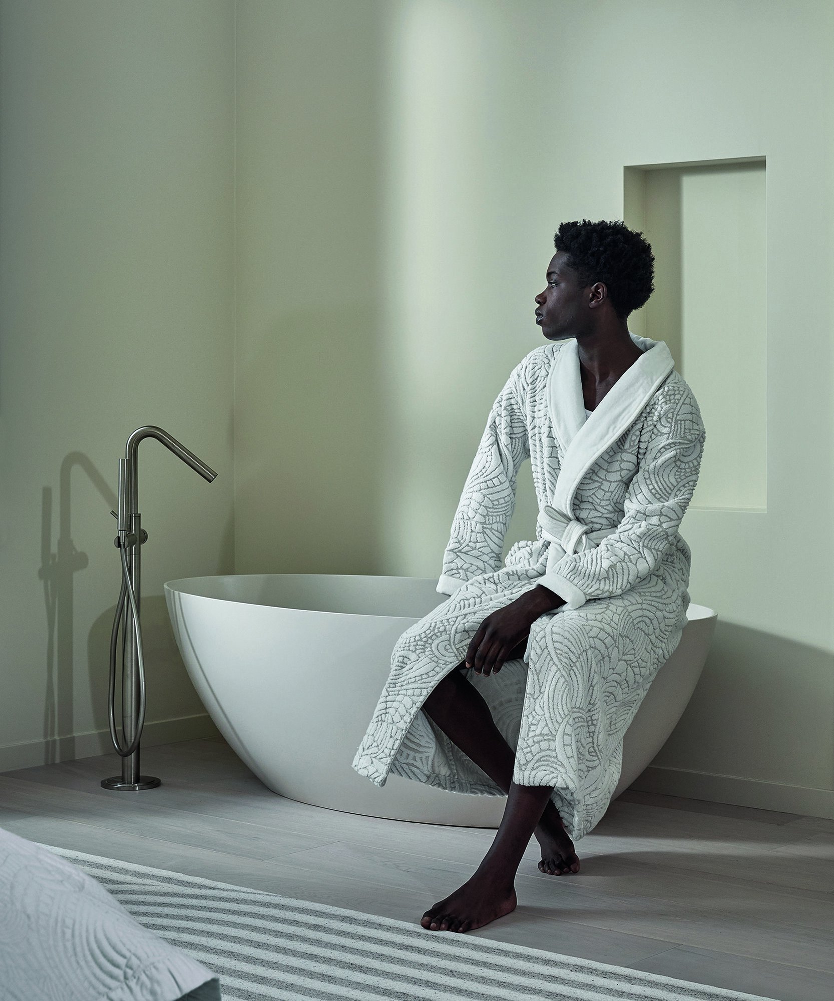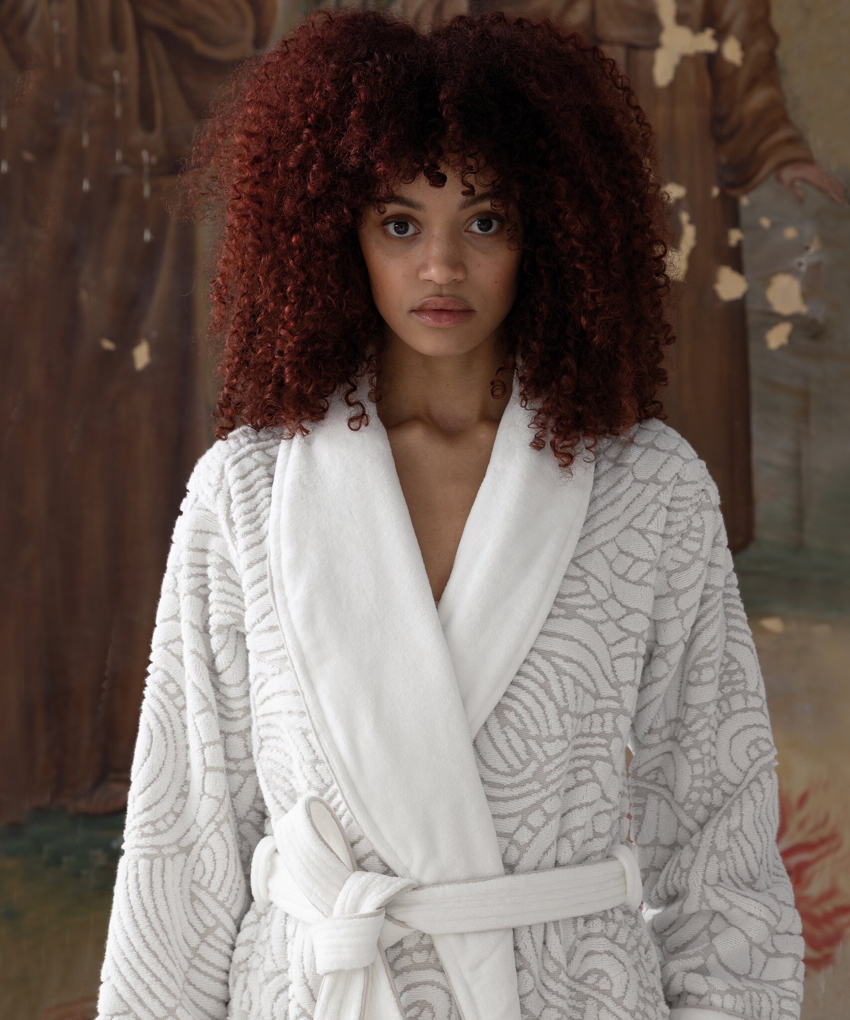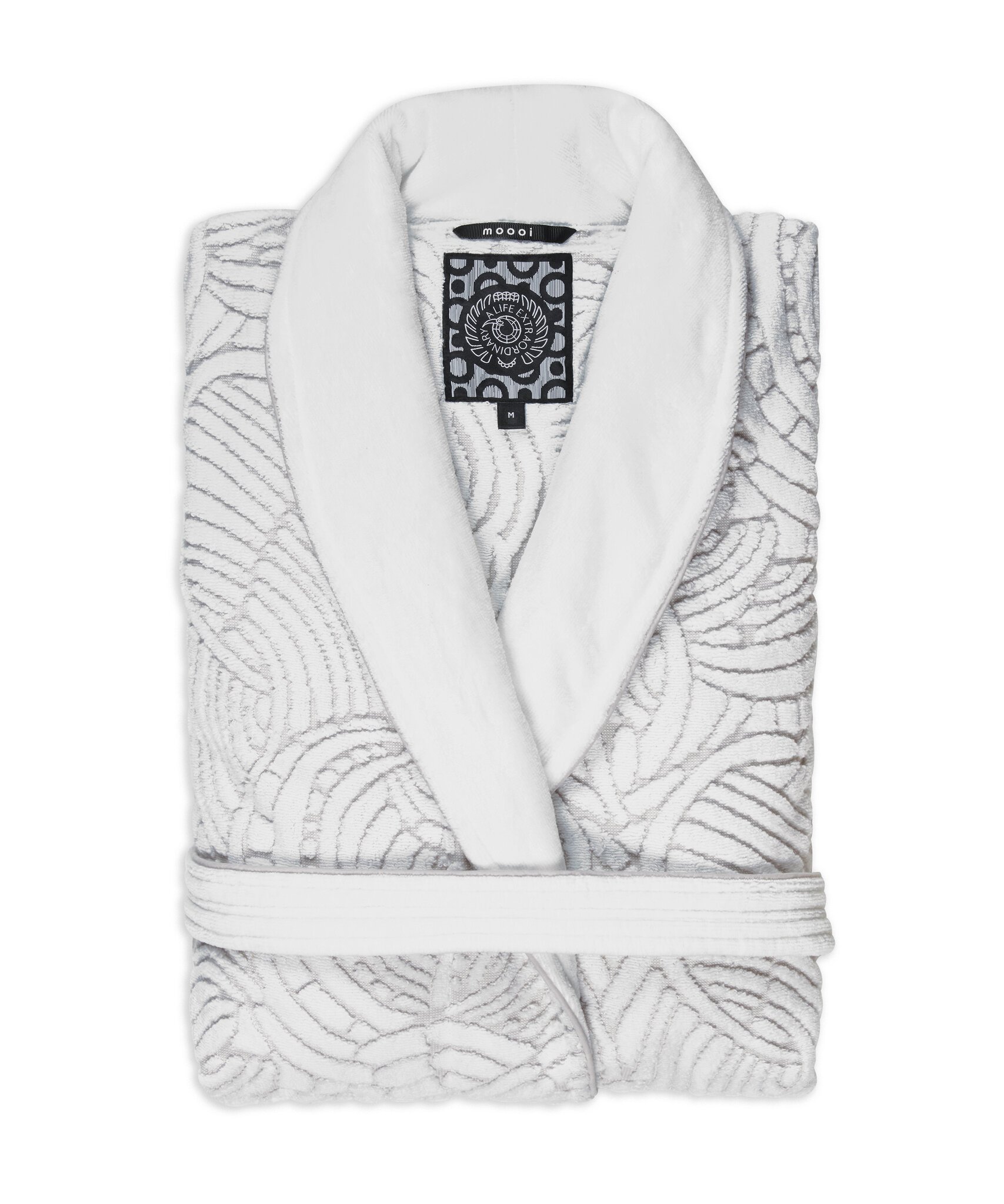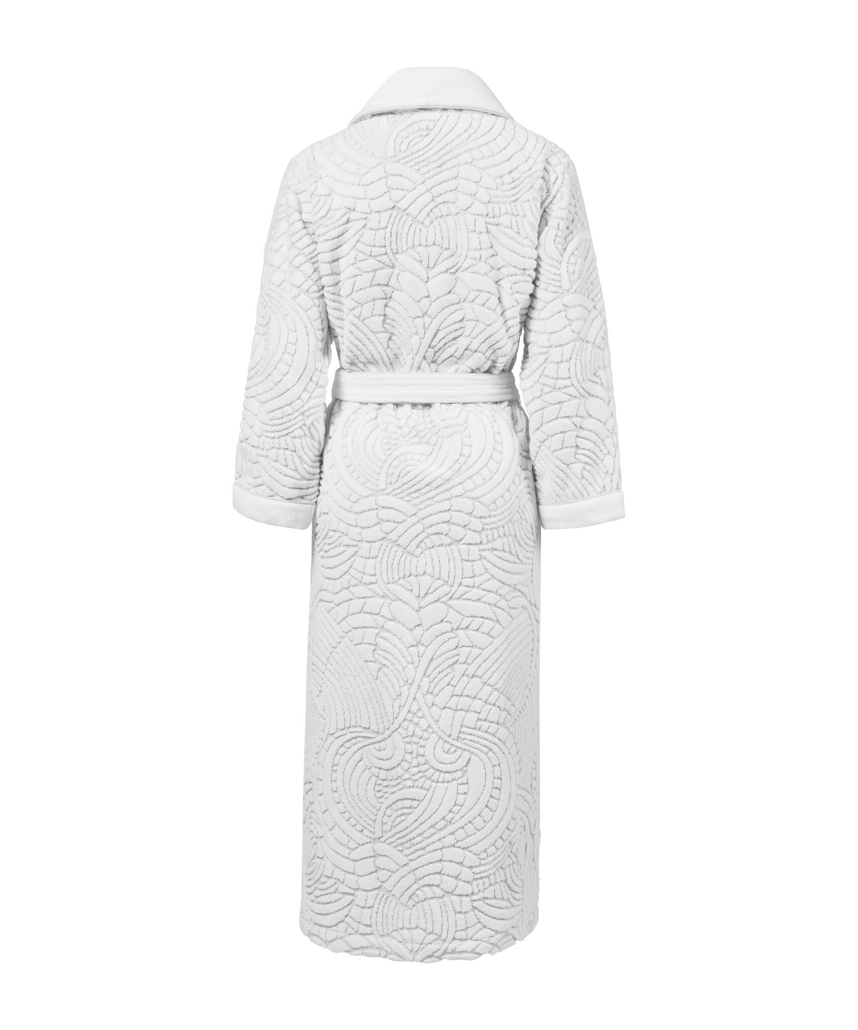 Balts premium kvalitātes halāts. Iedvesmots no Maurīcijas salas lielākā izmirušā Dodo putna spalvu raksta, šis halāts izceļas ar unikālu žakarda rakstu, kas ieausts tieši auduma struktūrā – tas ir ne tikai raksts, bet arī sajūta.