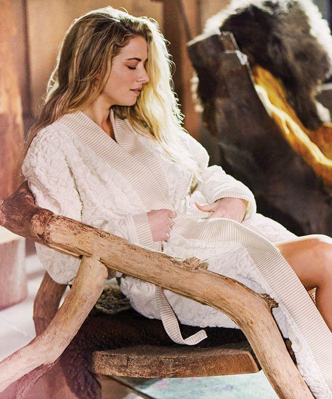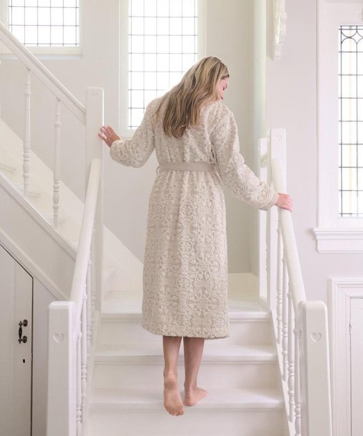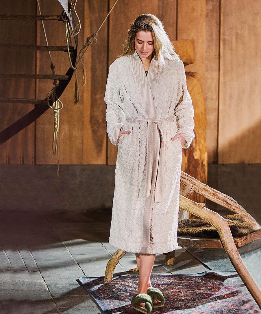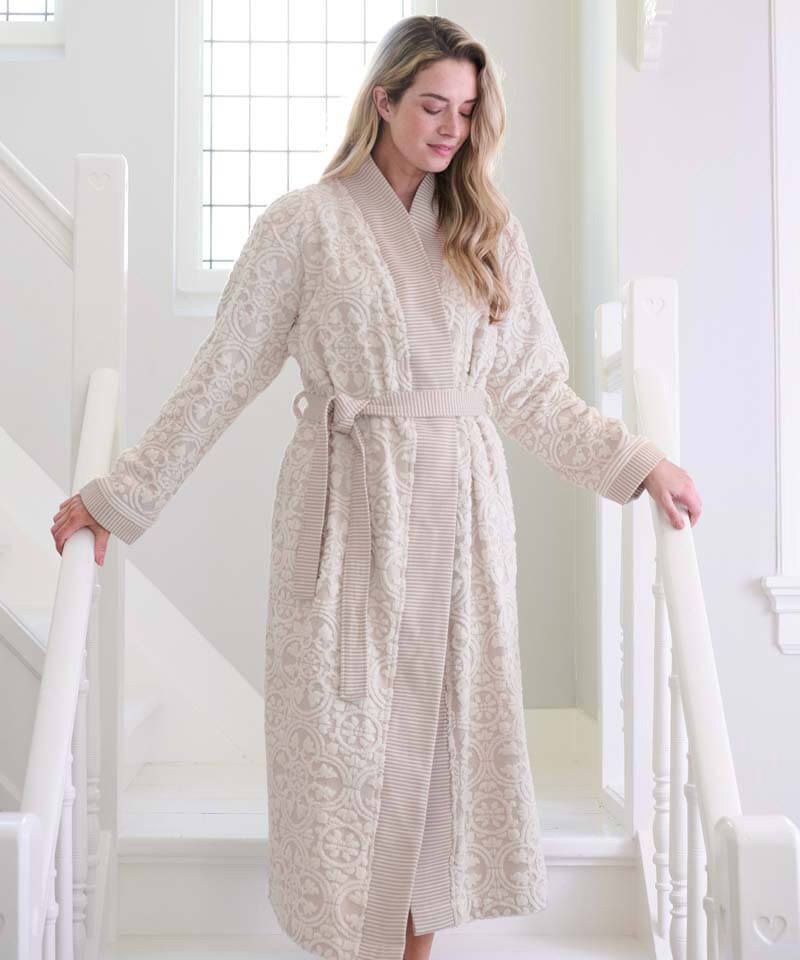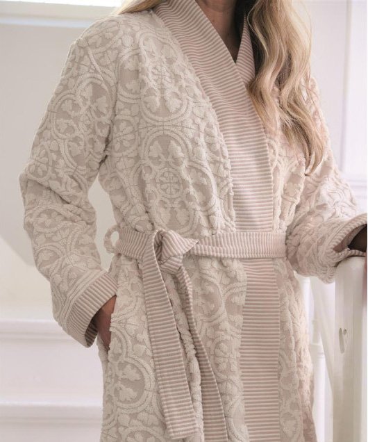 Gaišs, bēšas krāsas halāts ar reljefu, elegantu dizainu un tonālu flīžu motīvu. Piedurknēm, apkaklei un jostai ir austs divkrāsu svītru raksts, radot rotaļīgu kombinētu efektu.
