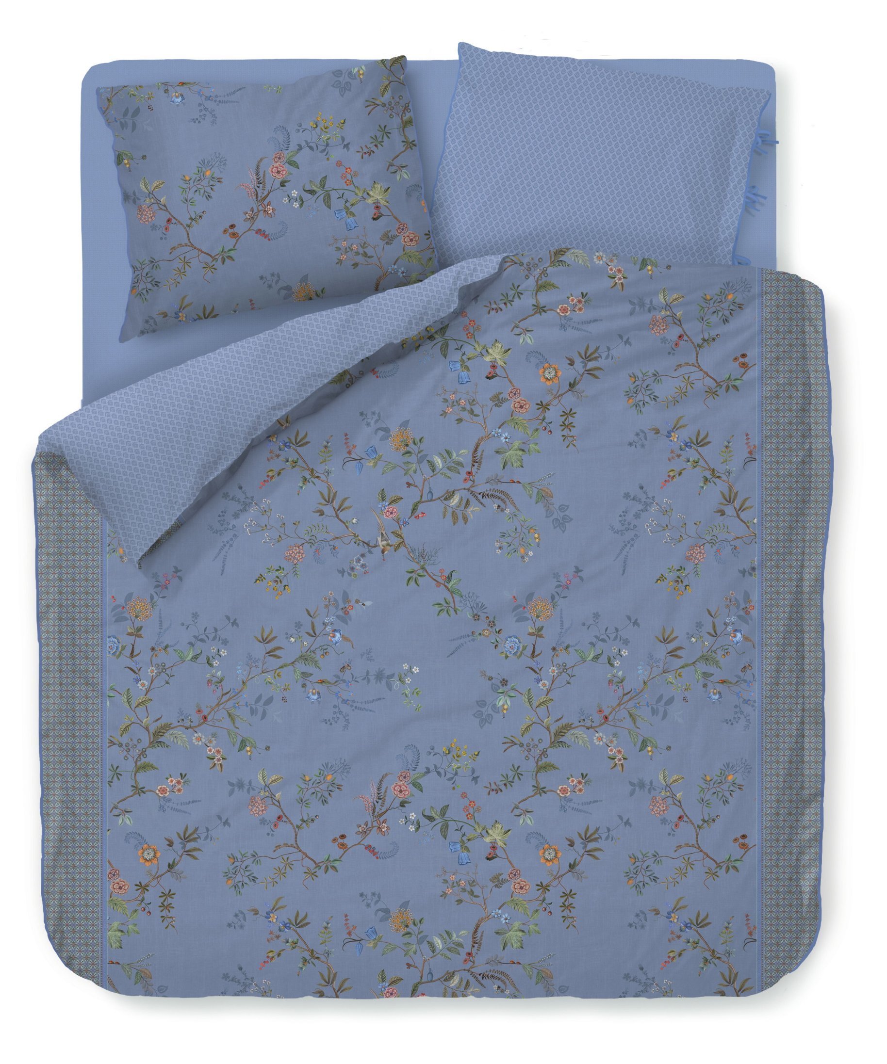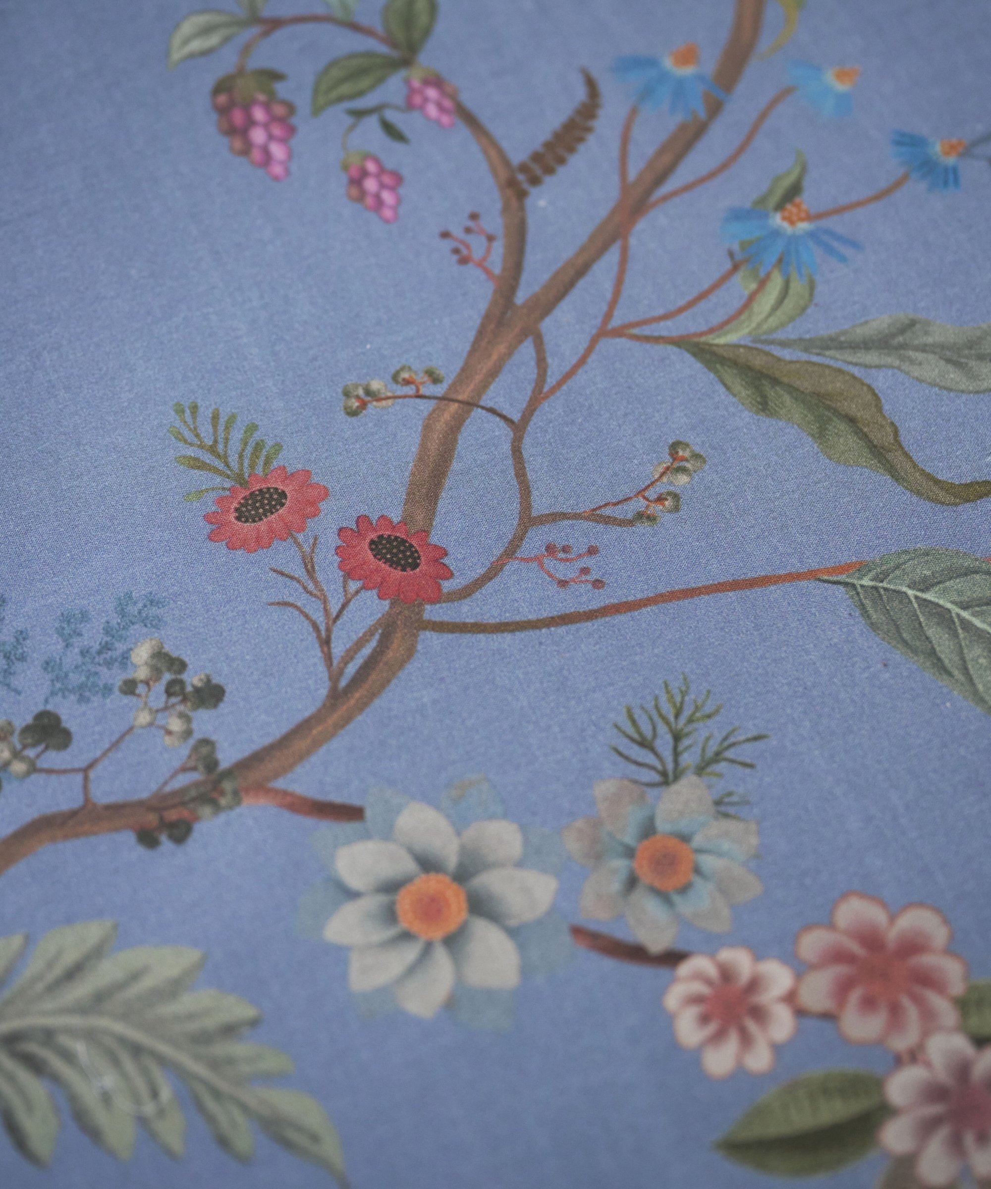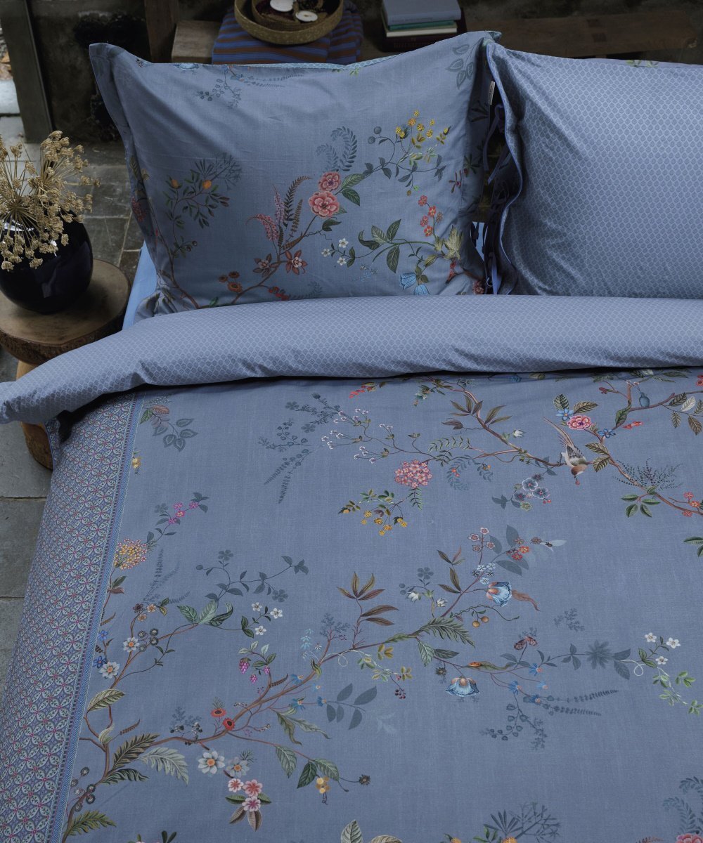 Gultas veļas komplekts Bustani Blue ar smalku ziedu rakstu un ornamentiem pārvalku abās garākajās malās. Otra puse pārvalkam un spilvendrānai ir ar smalku, stilizētu rūtiņu rakstu, zilā un gaiši zilā krāsā. Pārvalka un spilvena sānu malas apšūtas ar dekoratīvu, noapaļotu lentīti zilā krāsā. Spilvendrānas ar sasienamām aukliņām, līdz ar to izmantojamas no abām pusēm, radot vajadzīgo noskaņu.