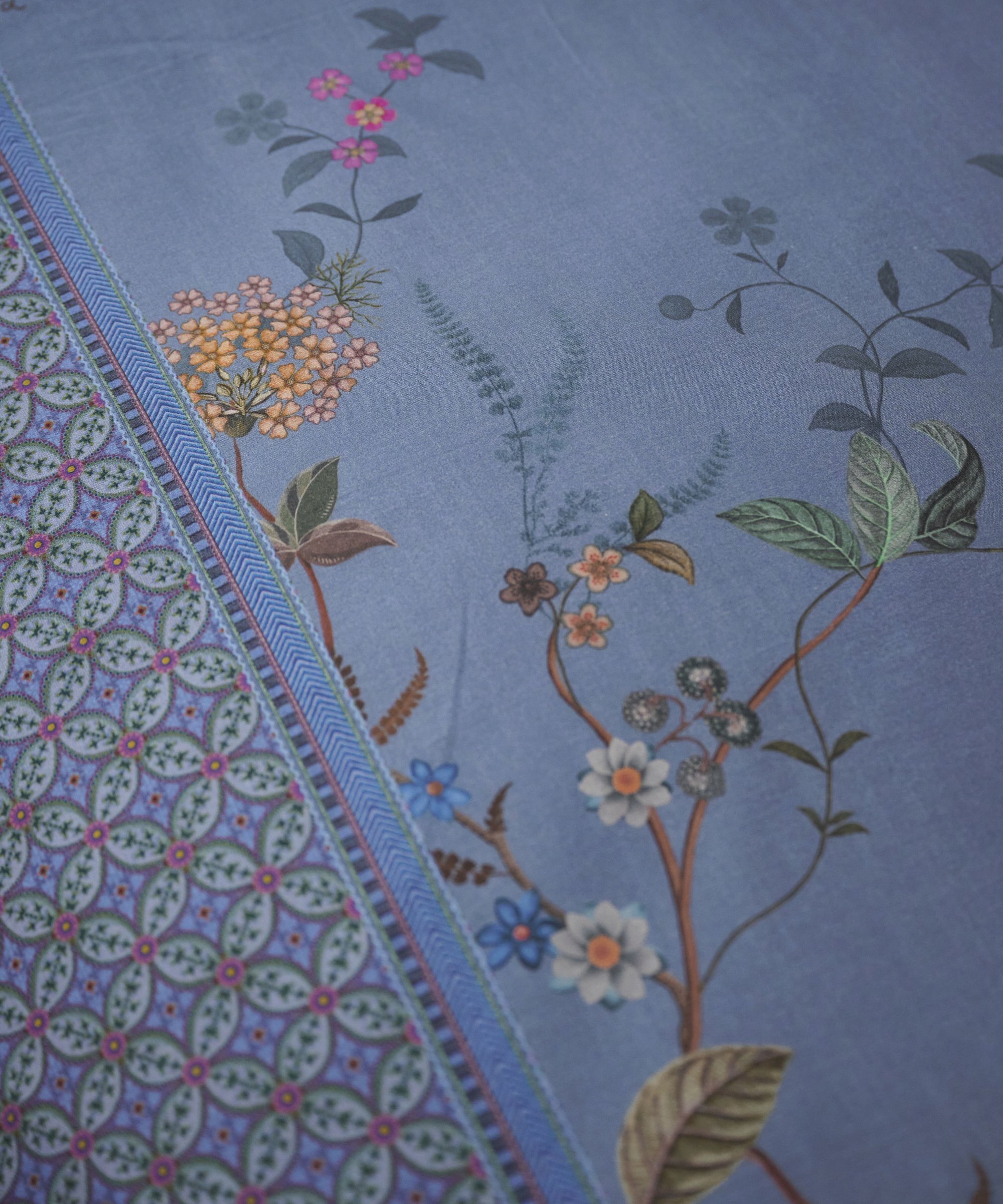 Gultas veļas komplekts Bustani Blue ar smalku ziedu rakstu un ornamentiem pārvalku abās garākajās malās. Otra puse pārvalkam un spilvendrānai ir ar smalku, stilizētu rūtiņu rakstu, gaišā rozā krāsā. Pārvalka un spilvena sānu malas apšūtas ar dekoratīvu, noapaļotu lentīti rozā krāsā. Spilvendrānas ar sasienamām aukliņām, līdz ar to izmantojamas no abām pusēm, radot vajadzīgo noskaņu.