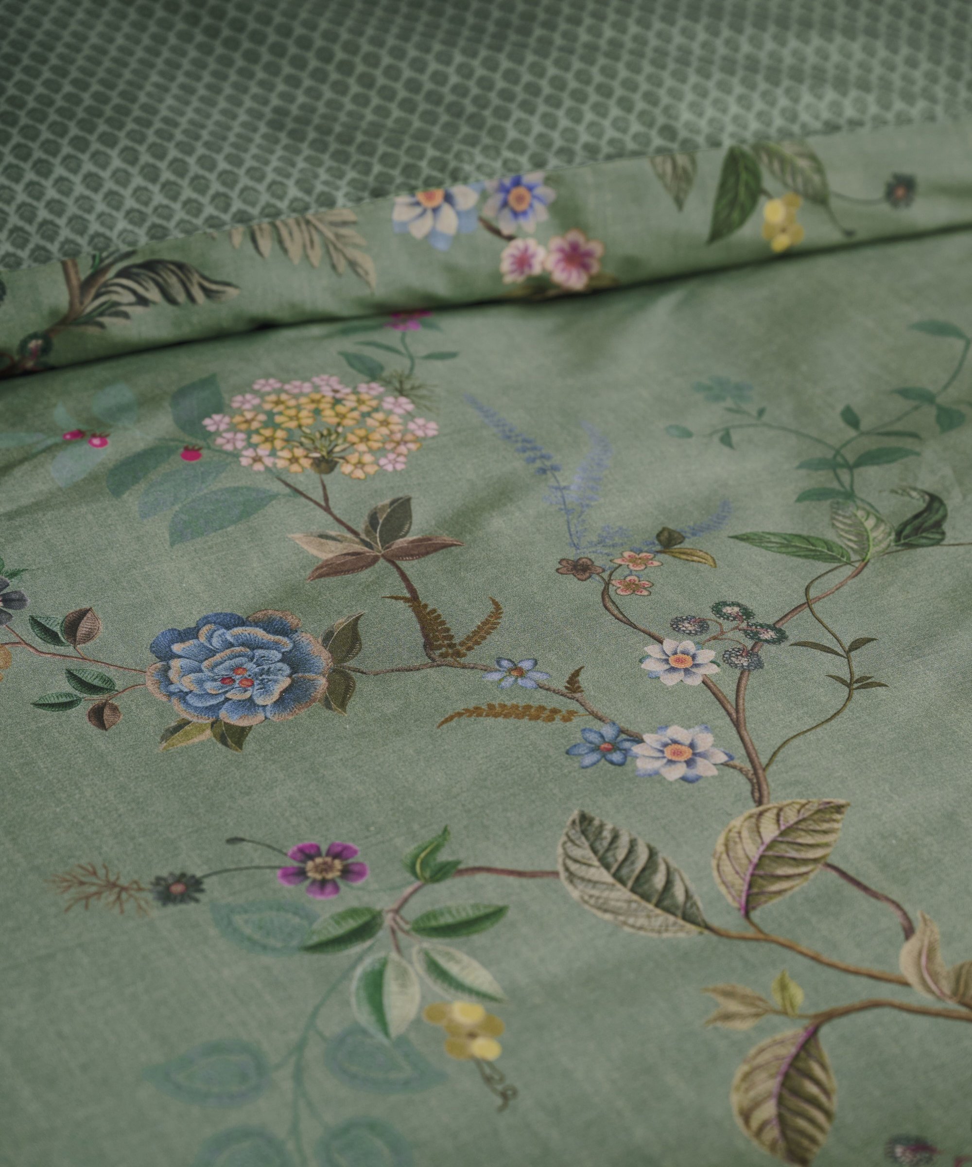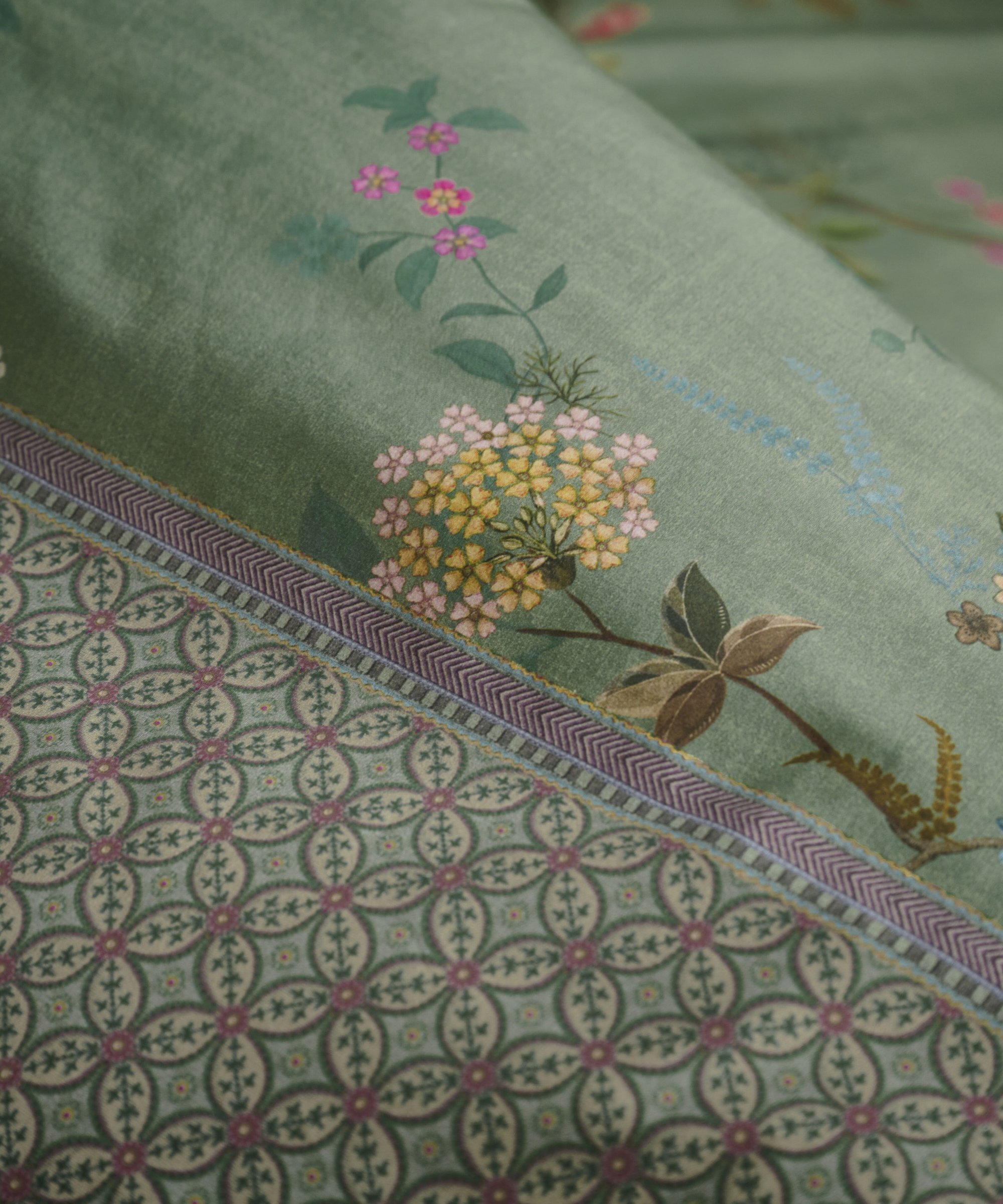 Gultas veļas komplekts Bustani Blue ar smalku ziedu rakstu un ornamentiem pārvalku abās garākajās malās. Otra puse pārvalkam un spilvendrānai ir ar smalku, stilizētu rūtiņu rakstu, zaļā un gaiši zaļā krāsā. Pārvalka un spilvena sānu malas apšūtas ar dekoratīvu, noapaļotu lentīti violeti bordo krāsā. Spilvendrānas ar sasienamām aukliņām, līdz ar to izmantojamas no abām pusēm, radot vajadzīgo noskaņu.