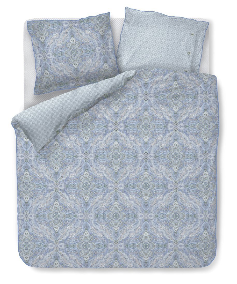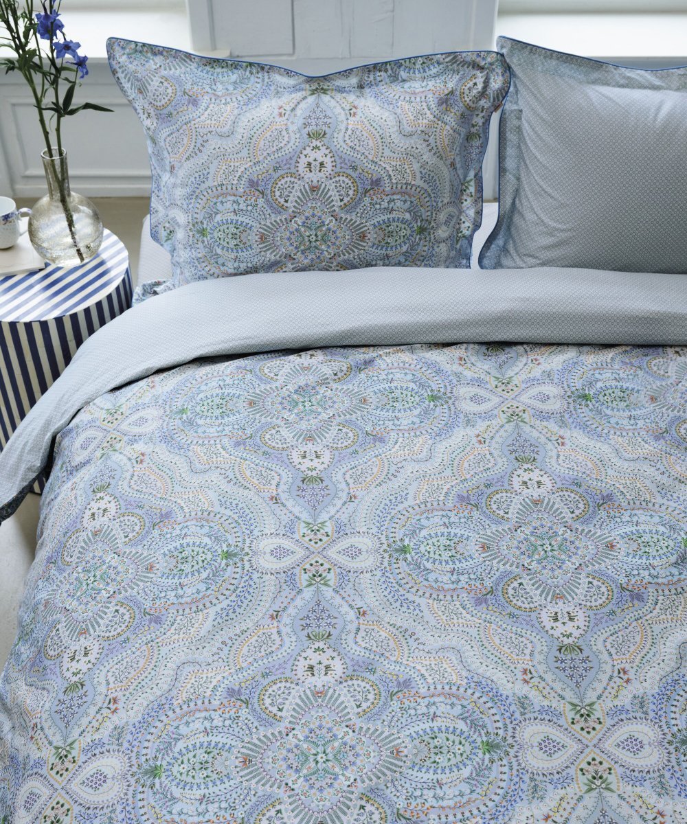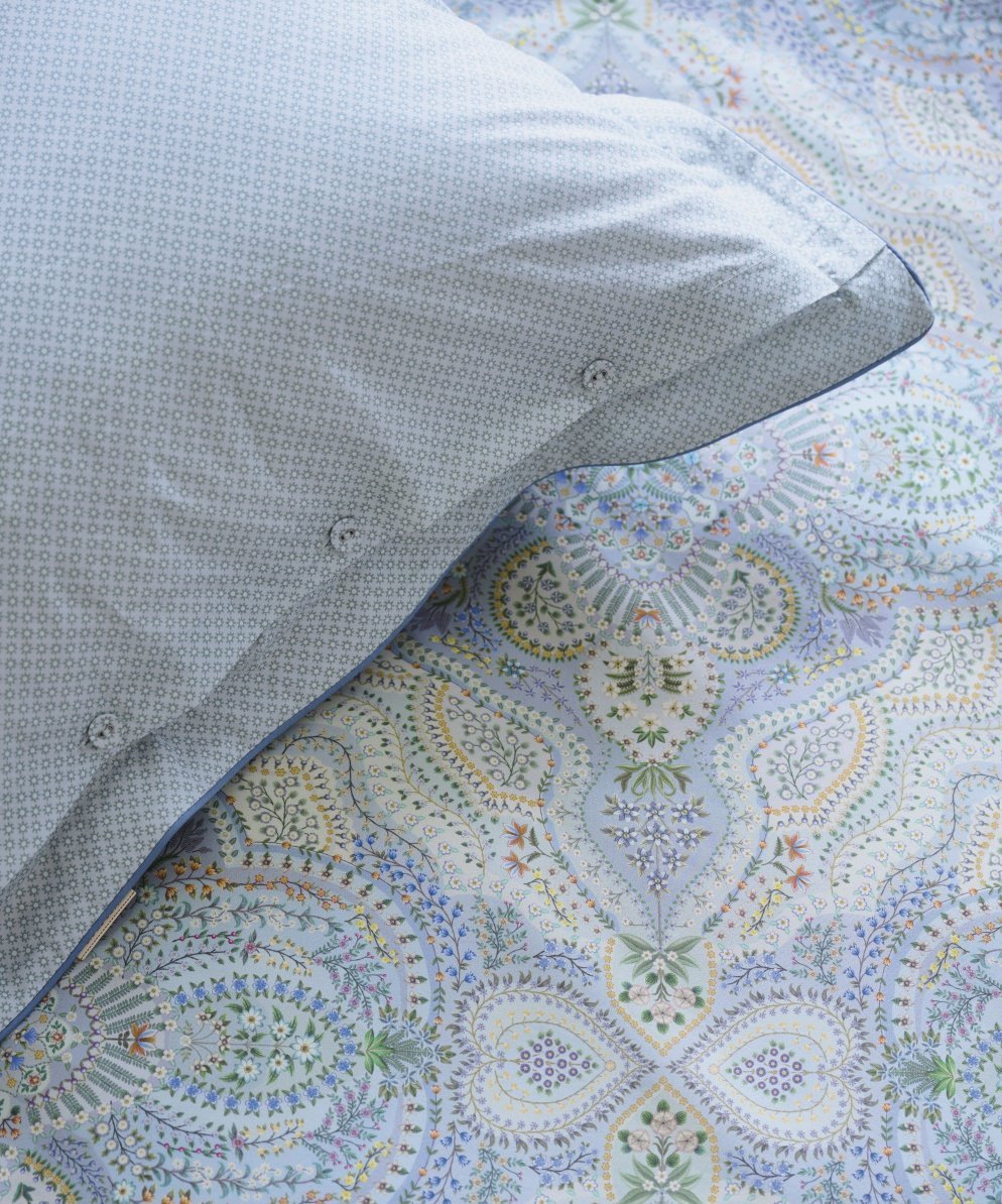 Gultasveļas pārvalks Moon Flower Light Blue ir rūpīgi izstrādāts dizains ar ziediem un austrumu motīviem maigi zilos pasteļtoņos. Otra puse ar rotaļīgu zvaigžņu apdruku. Pārvalks un spilvendrānas apdarinātas ar dekoratīvu apaļu maliņu zilā tonī, spilvenu pārvalkiem aizdare ar audumu apvilktām pogām, ļaujot gan pārvalkam, gan spilvendrānai izmantot abas puses.