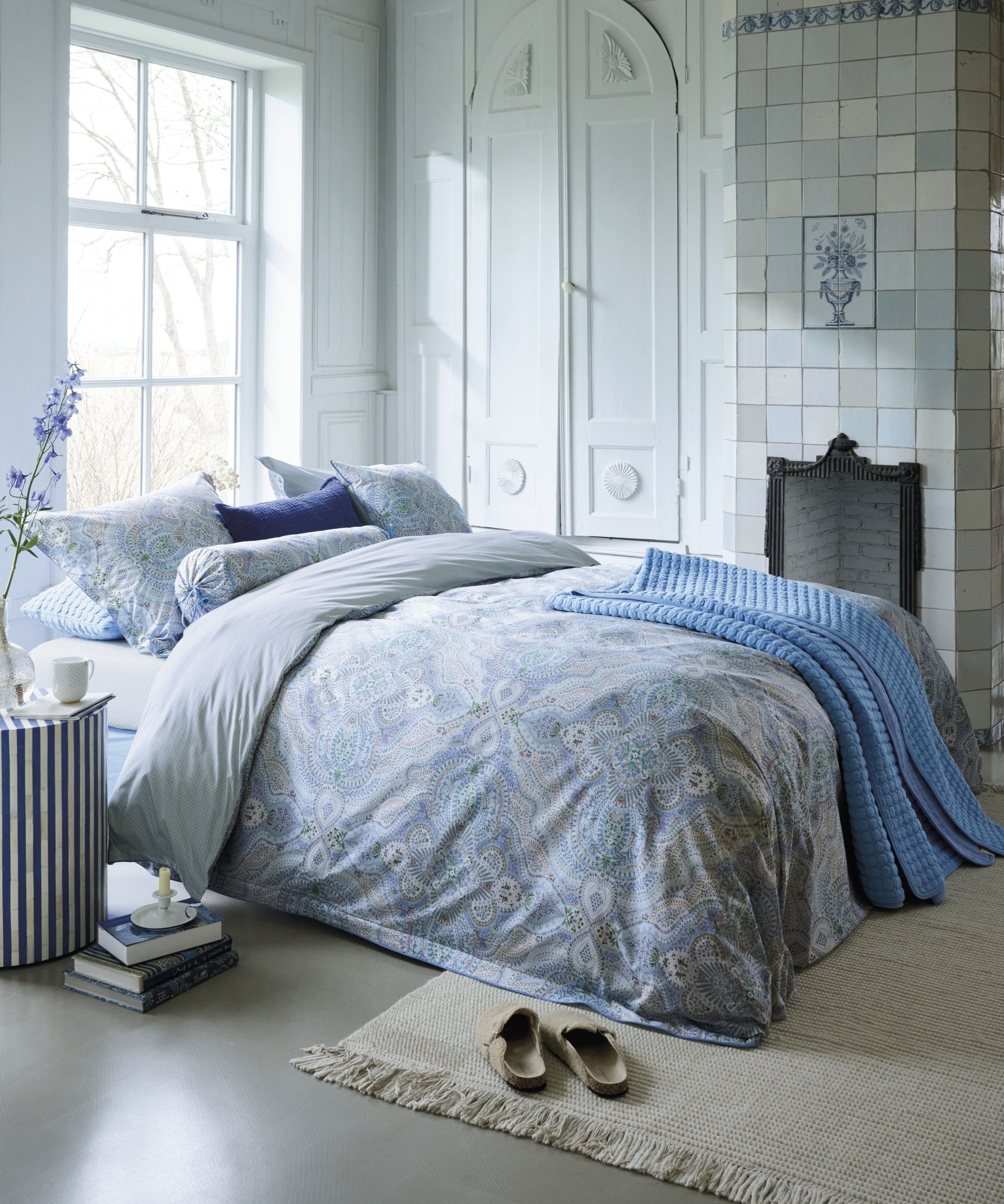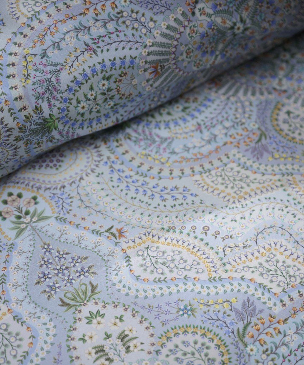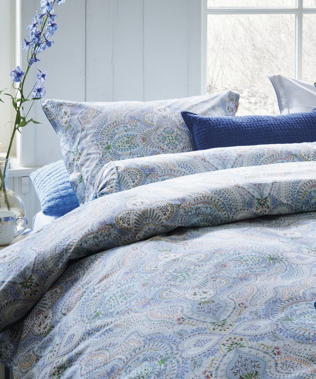 Gultasveļas pārvalks Moon Flower Light Blue ir rūpīgi izstrādāts dizains ar ziediem un austrumu motīviem maigi zilos pasteļtoņos. Otra puse ar rotaļīgu zvaigžņu apdruku. Pārvalks un spilvendrānas apdarinātas ar dekoratīvu apaļu maliņu zilā tonī, spilvenu pārvalkiem aizdare ar audumu apvilktām pogām, ļaujot gan pārvalkam, gan spilvendrānai izmantot abas puses.