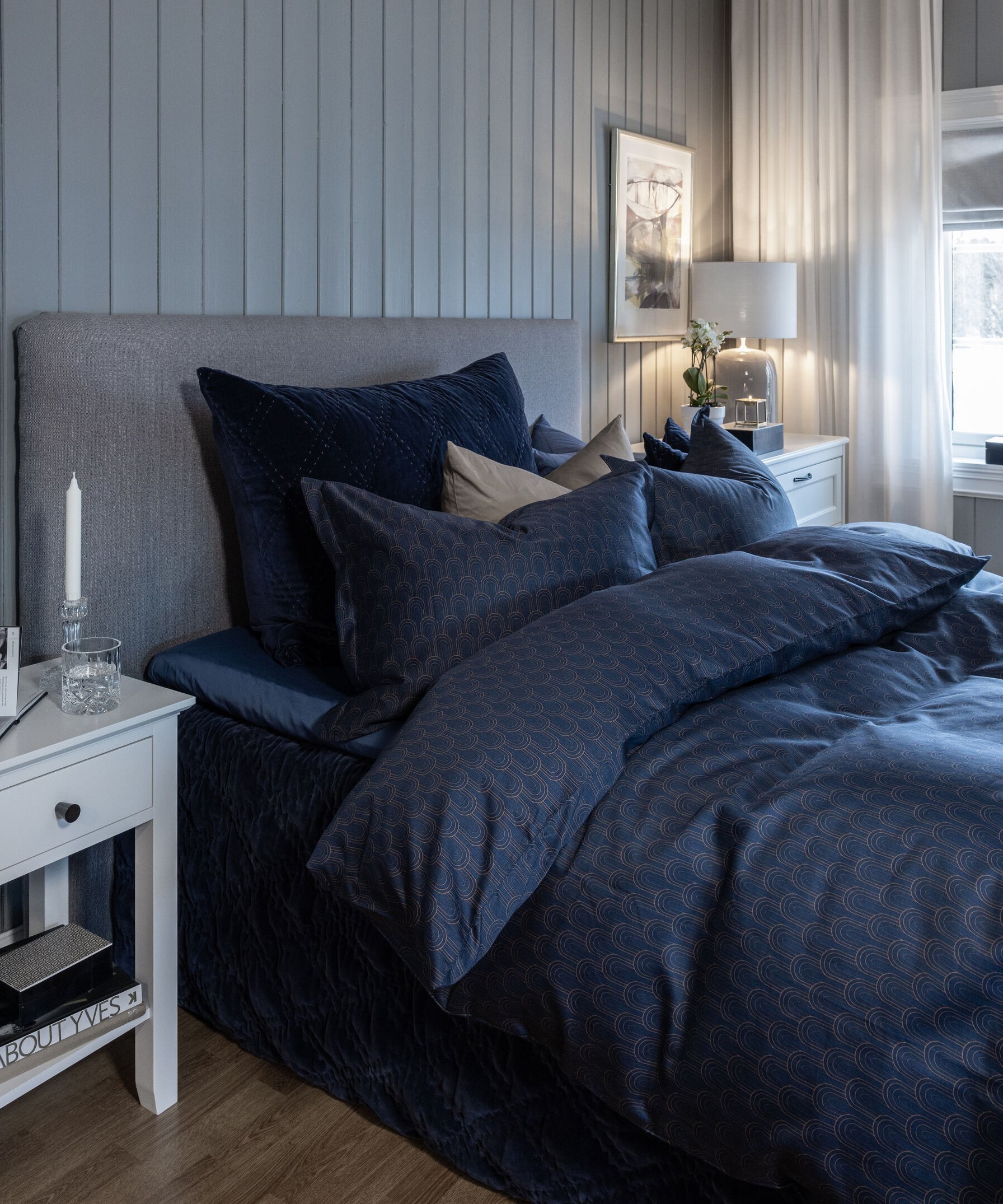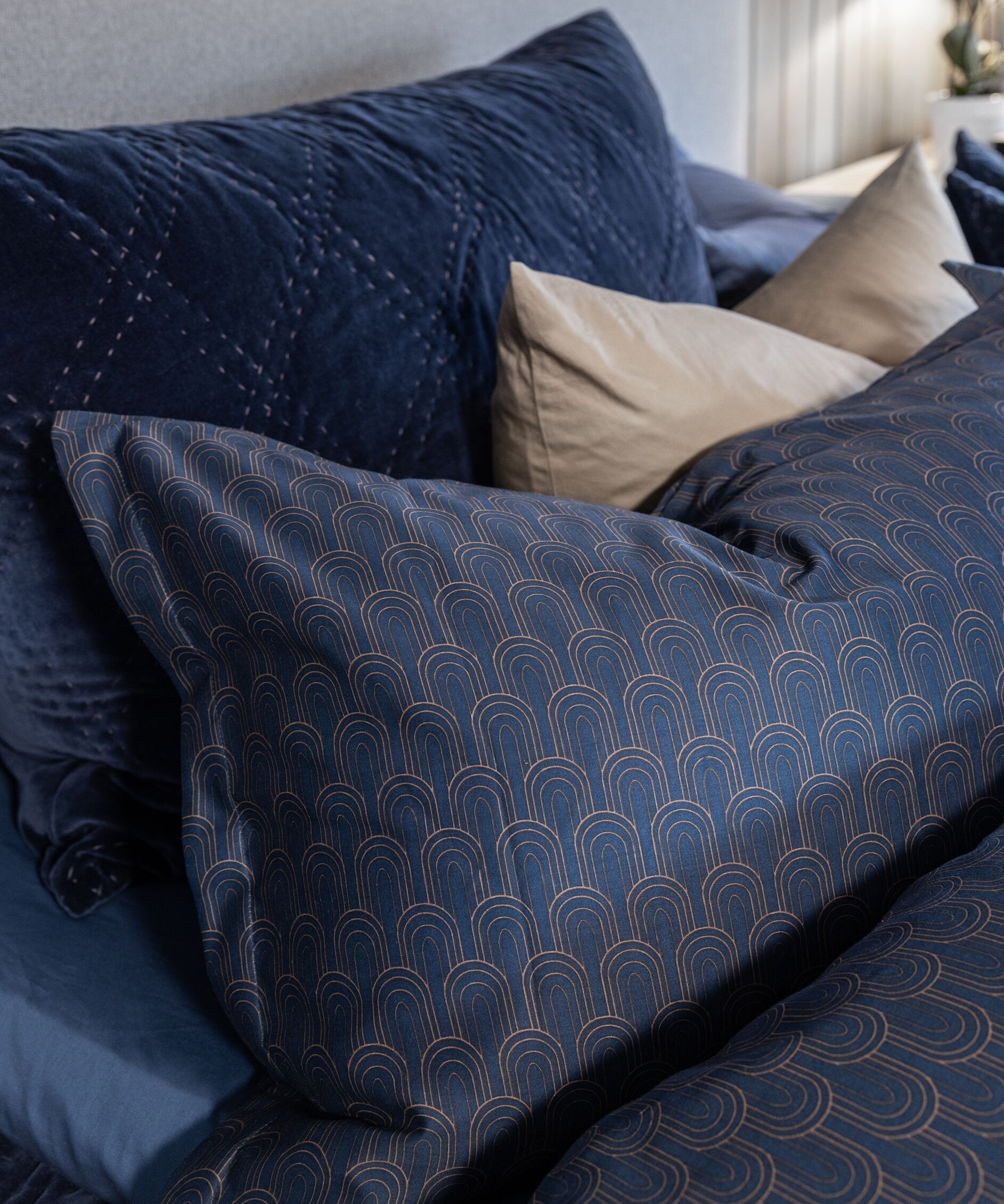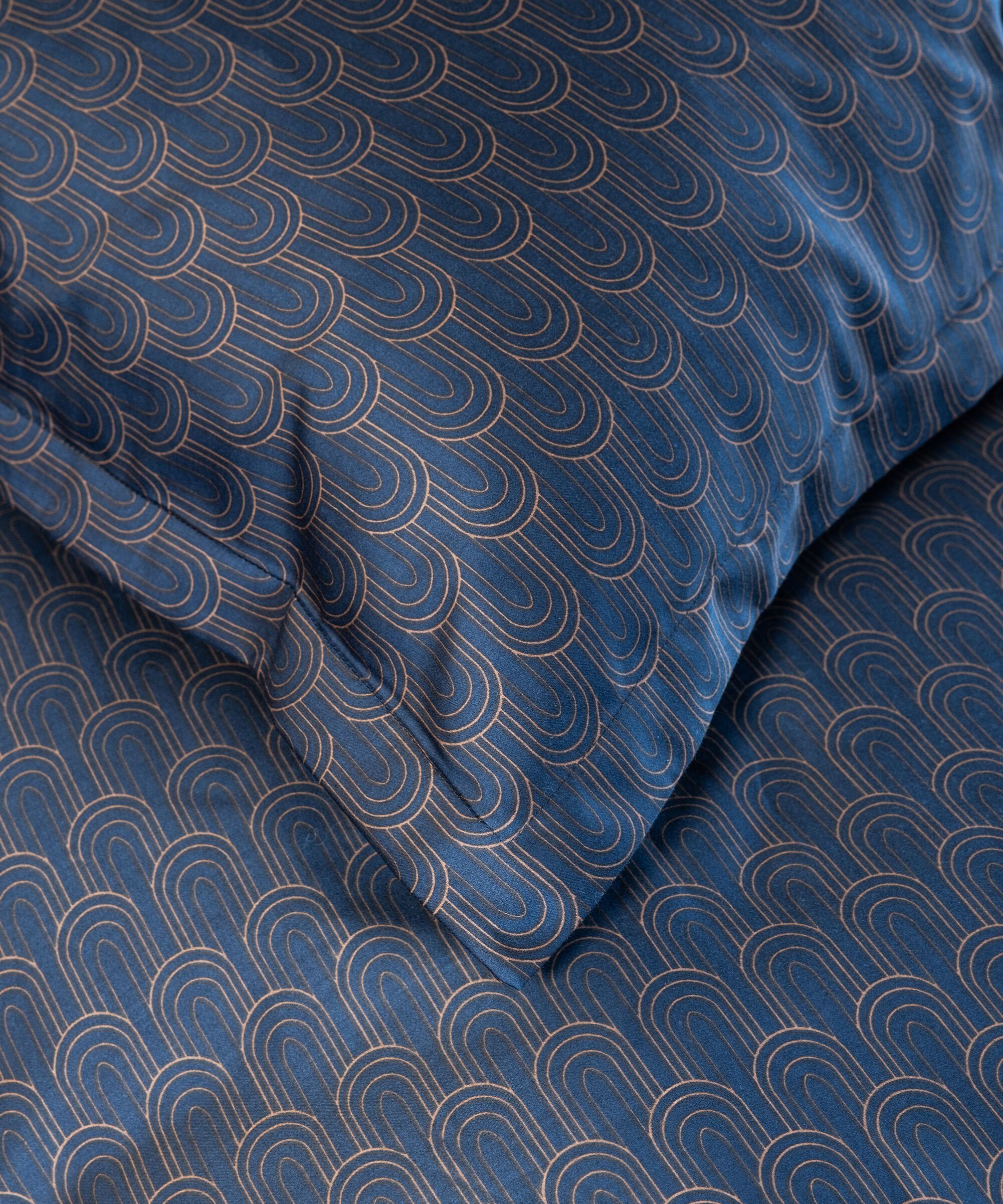 Betty Blue gultas veļas komplekts no maiga satīna auduma, tumši zilā krāsā, ar elegantu rakstu zeltainā tonī. Komplekts ar dizainu, kas guļamistabai piešķirs izsmalcinātu atmosfēru.