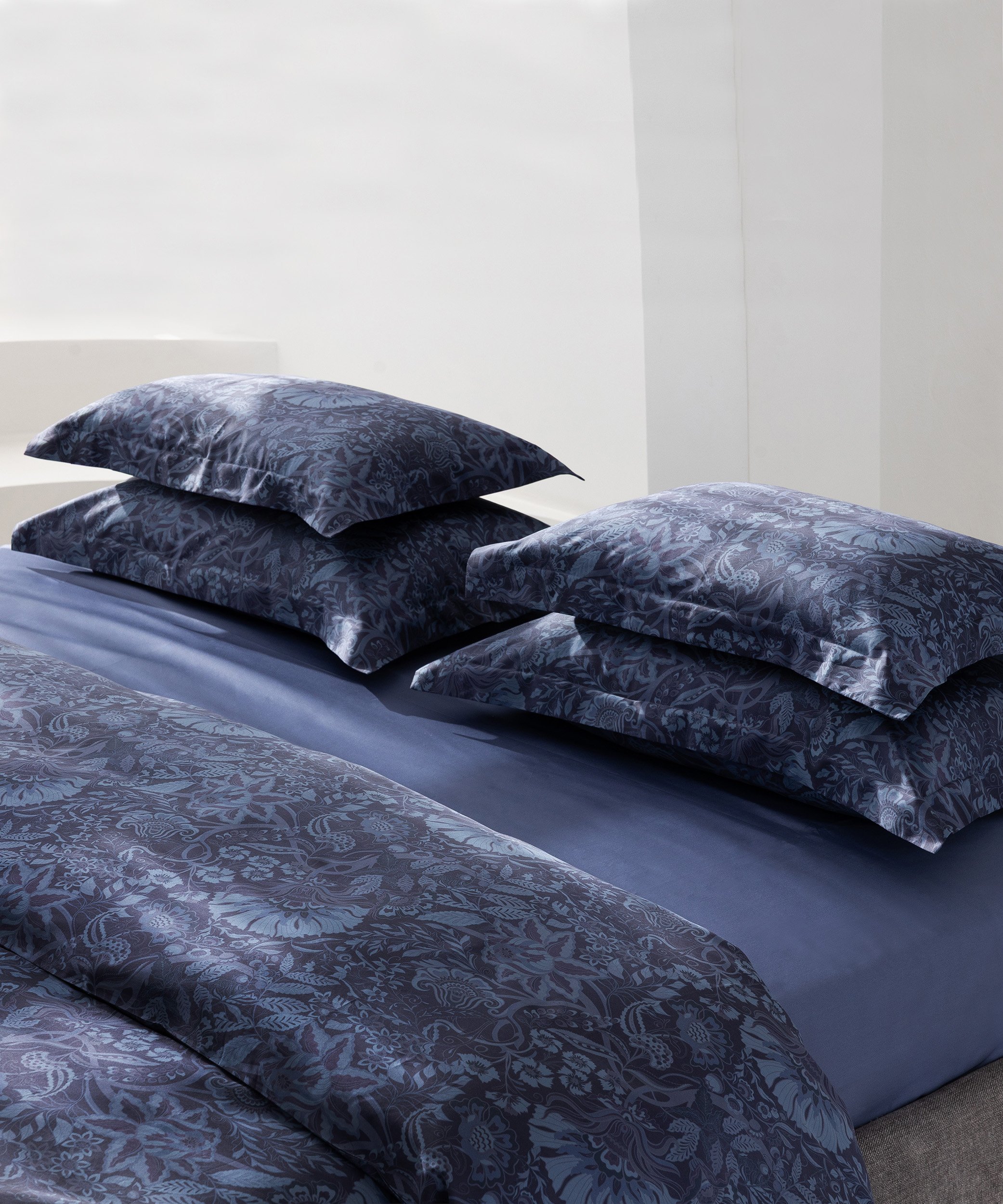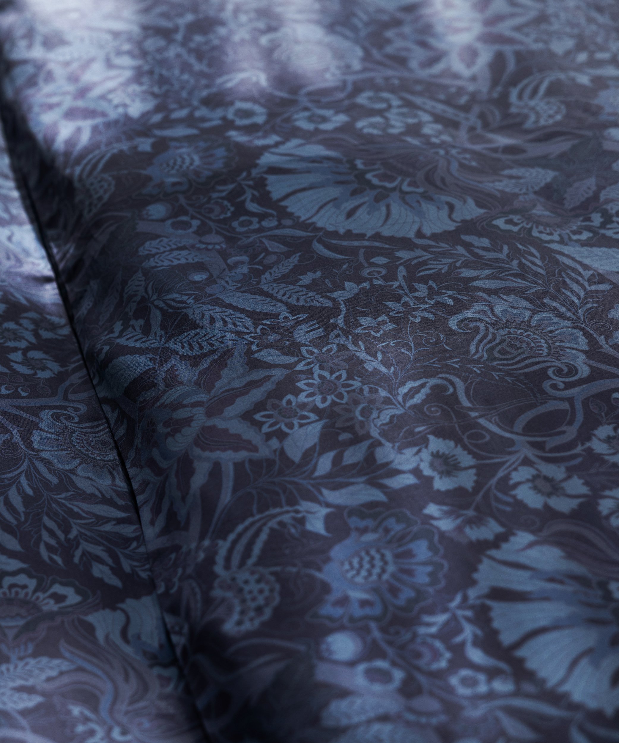 Komplekts Boho Indigo – ziedu un augu motīvi uz bagātīgi tumši zila fona, harmoniskai un izsmalcinātai noskaņai. Patīkamais satīna auduma pieskāriens nodrošina komfortu un mājīgumu.