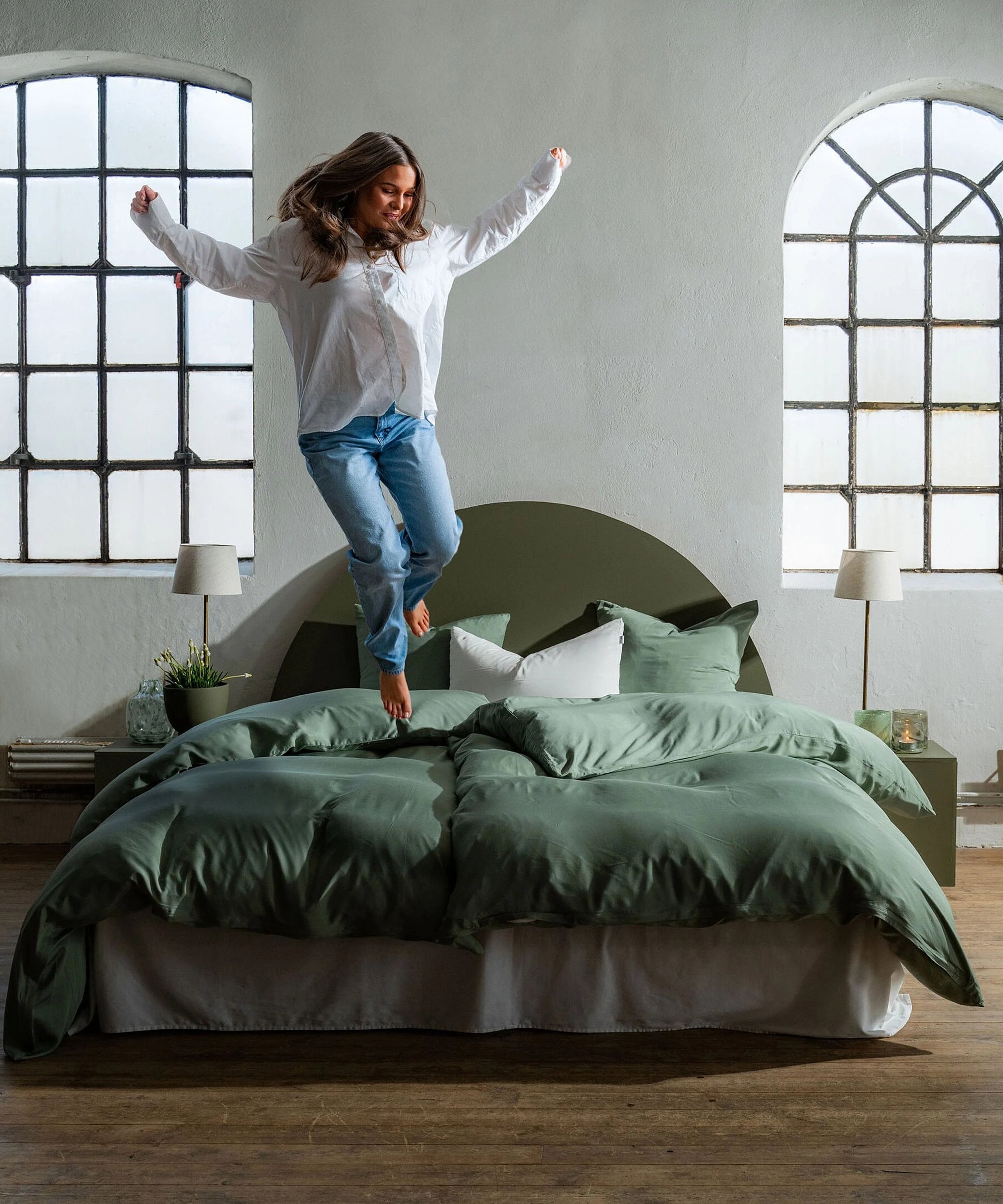 Turiform Enjoy gultasveļu gaiši zaļā krāsā. Šī gultasveļa ir izgatavota no 100% bambusa, un tā ir austa ar satīna aušanas veidu, lai tā būtu izturīga un zīdaini mīksta.