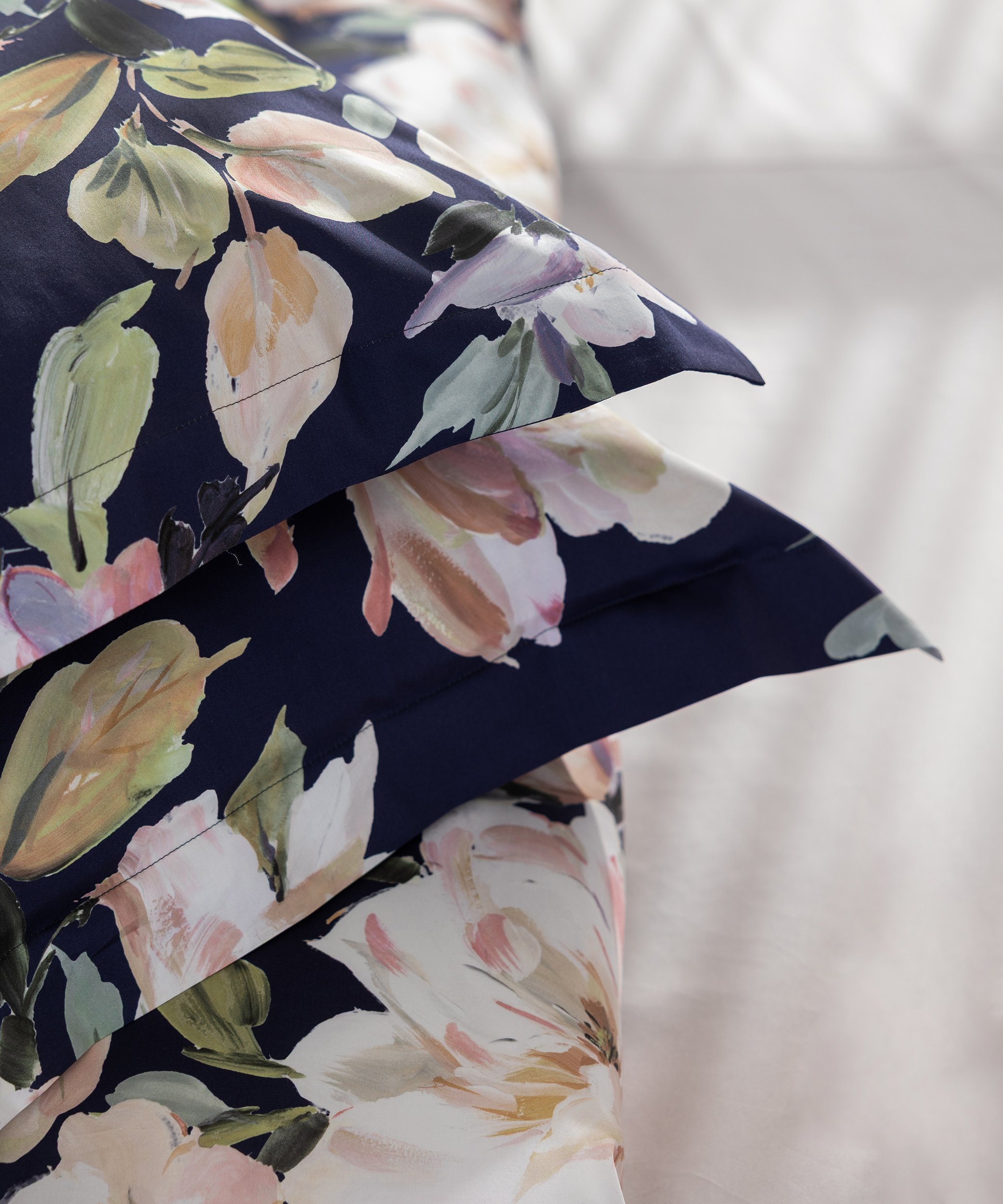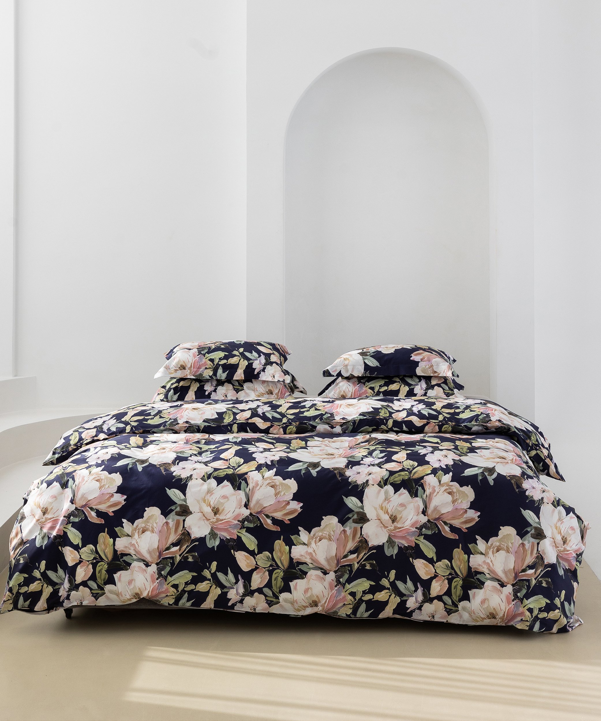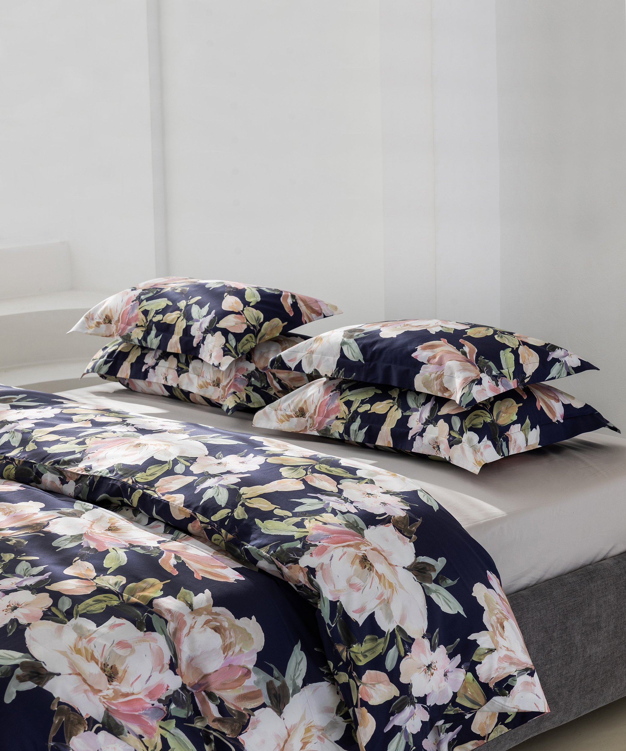 Satīna gultas veļas komplekts “Harmony Dark Blue” maigu pasteļtoņu ābeļu ziedi uz tumši zila fona – mājīgai un nomierinošai atmosfērai Jūsu guļamistabā. Ziedu motīvos izmantotajai plašajai krāsu paletei piestāvēs vairāki palagu krāsu varianti.