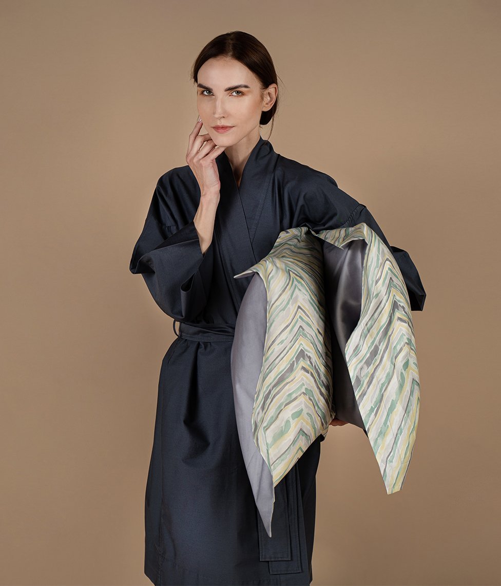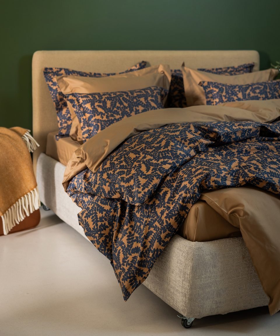 Tumši zili pelēcīgs, no dabas iedvesmots raksts uz piesātināta kanēļa krāsas fona – harmonisks gultas veļas komplekts elegantai un nomierinošai atmosfērai. Patīkamais satīna auduma pieskāriens nodrošina komfortu un mājīgumu. Abās puses vienādas – ar rakstu.