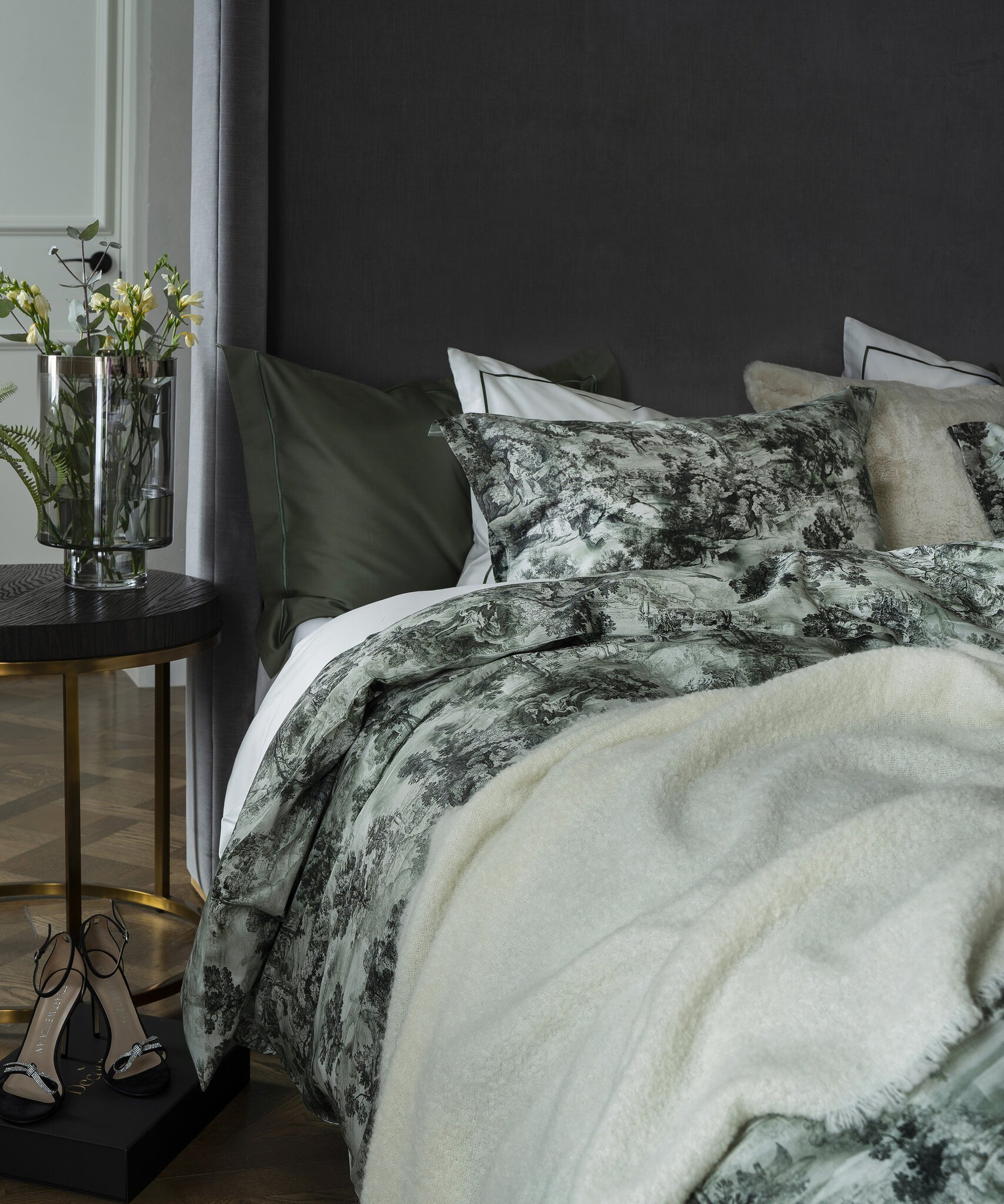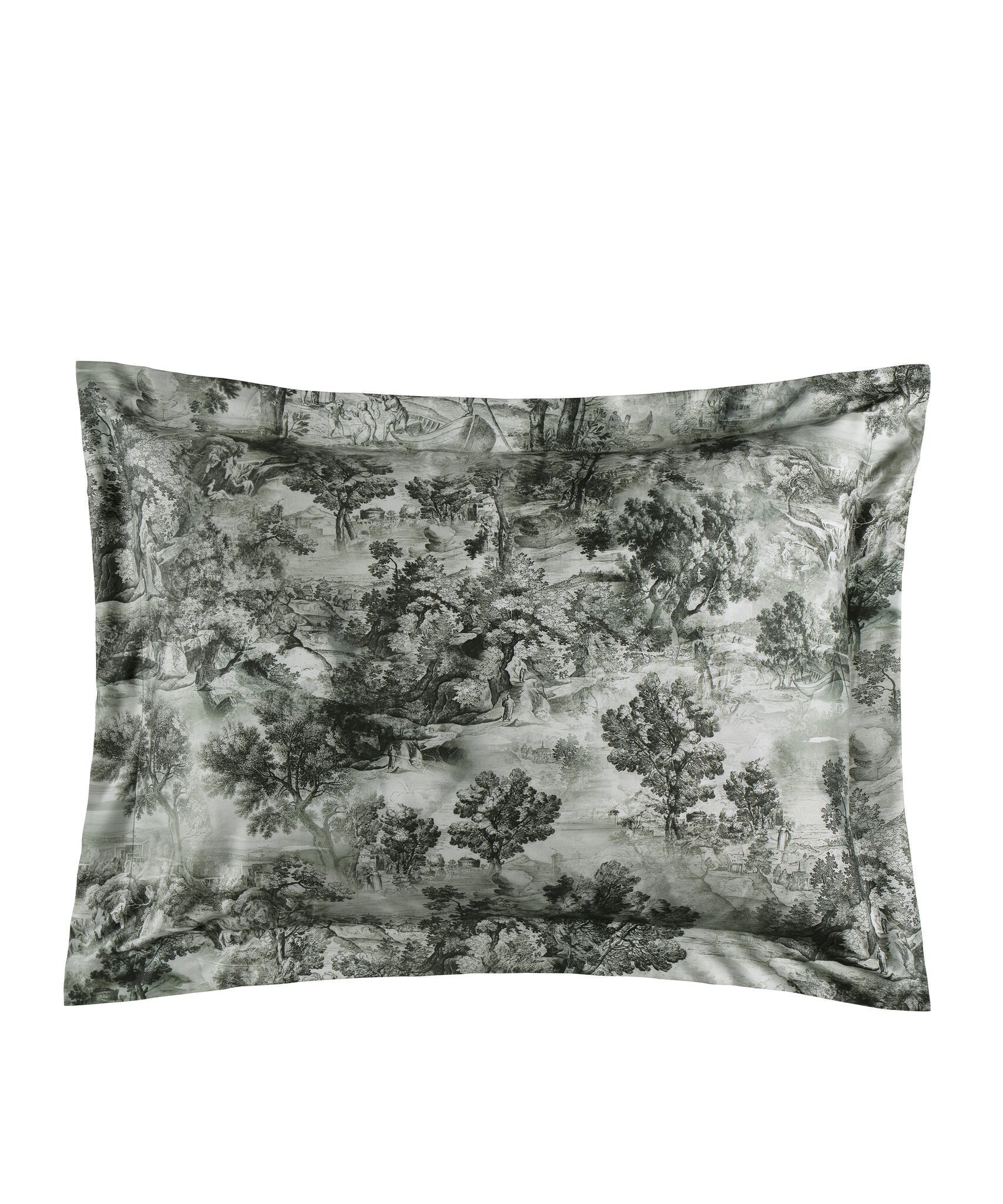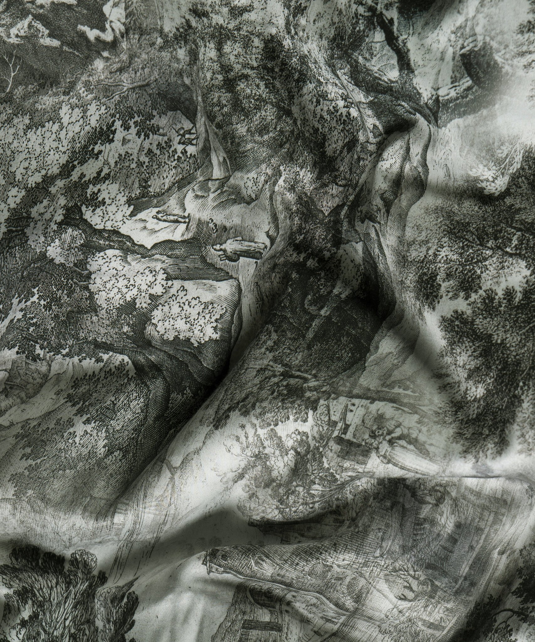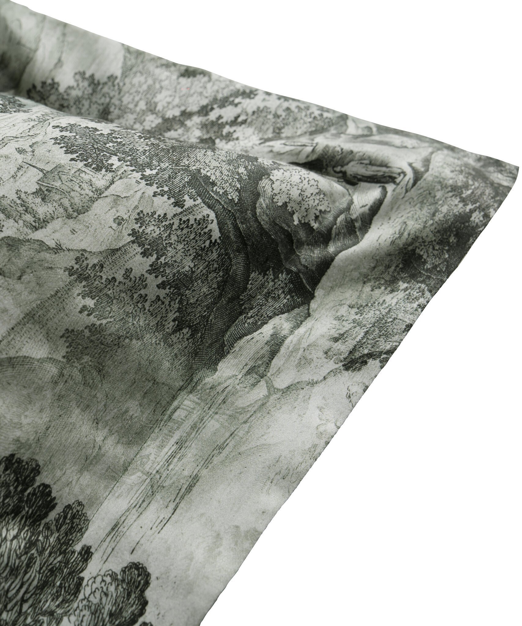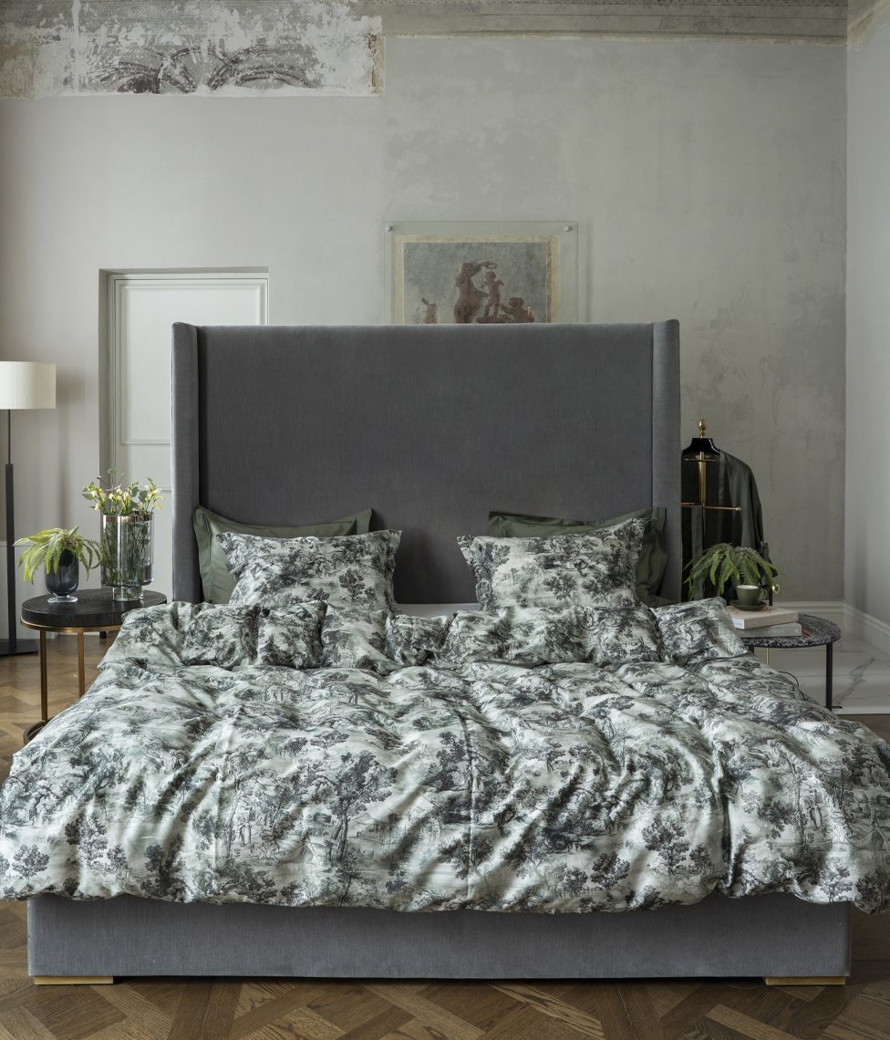 Kolekcija The Lovers Tale no maiga kokvilnas satīna. The Lovers Tale Moss pārvalka un spilvendrānas abas puses ir vienādas – ar zaļganu rakstu uz balta fona.