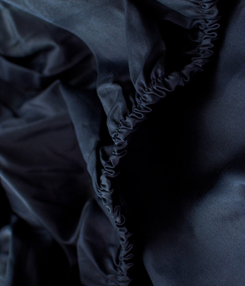 Tumši zilas krāsas satīna spilvendrāna, pieejama ar un bez dekoratīvi nošūtām maliņām. To var izmantot atsevišķi vai papildināt satīna gultas veļas komplektus.