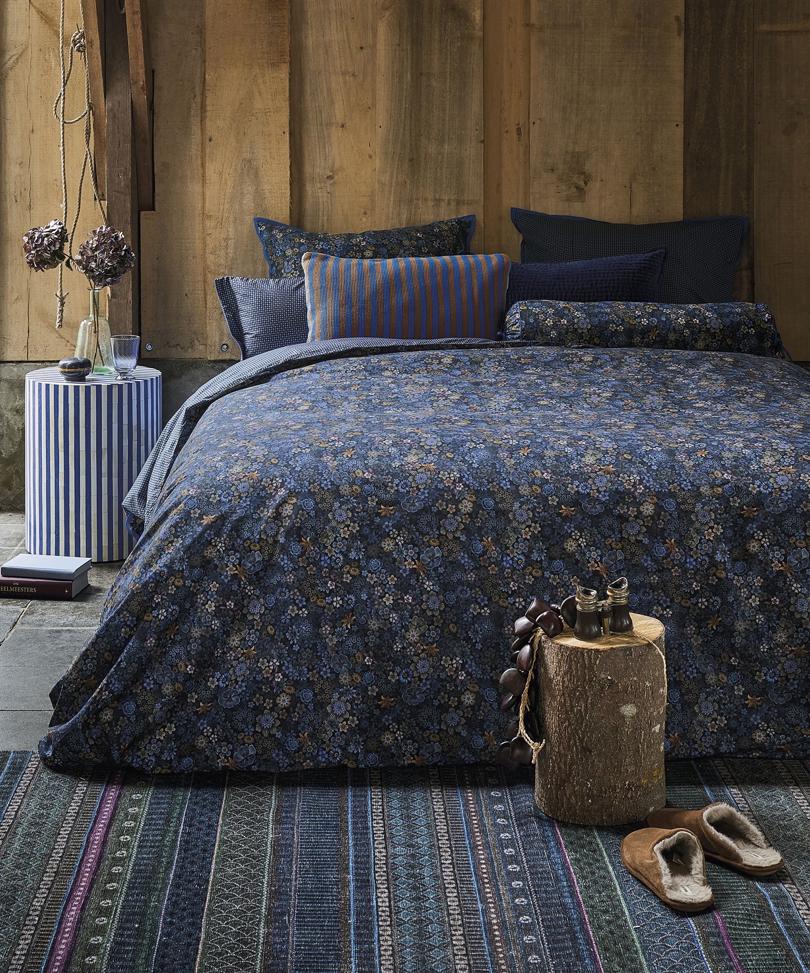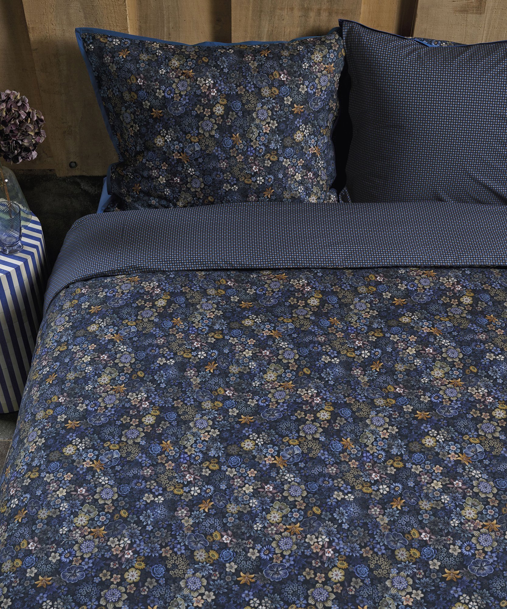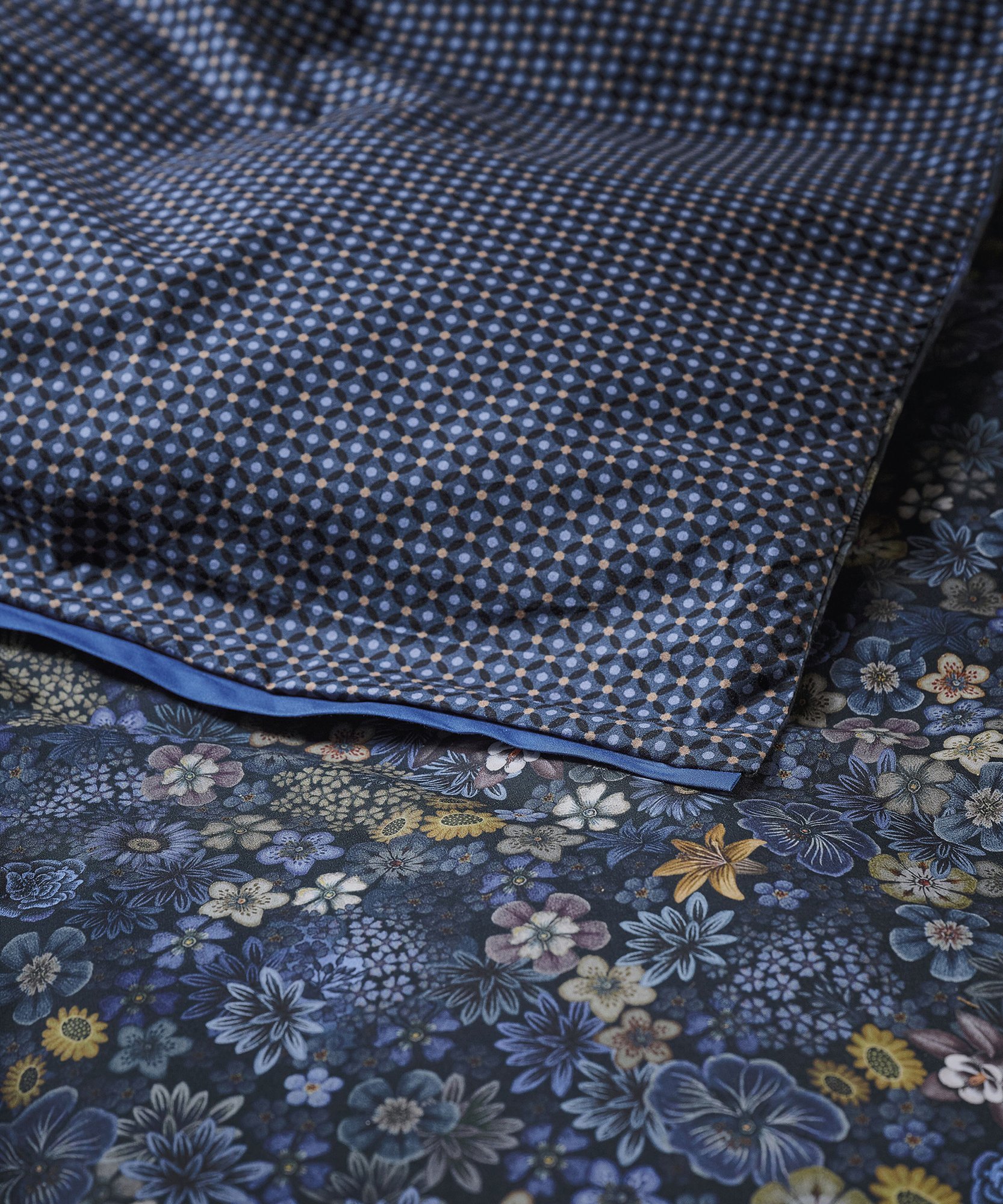Gultas veļas komplekts Tutti I Fiori tumši zilos toņos ar ziedu motīvu. Starp ziediem nelieli ziediņi ar spilgtāku krāsu, piešķirot dizainam bagātīgu izskatu. Otra puse pārvalkam un spilvendrānai ir ar smalku, stilizētu rūtiņu rakstu, zilos un bēšos toņos.