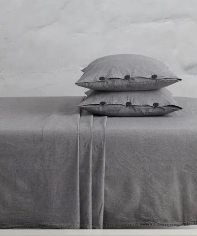 Palags bez gumijas no kokvilnas auduma pelēkā krāsā. Palags šūts no Chambray auduma, kas pēc struktūras un tekstūras līdzīgs lina audumam, tikai daudz vieglāks un mīkstāks.