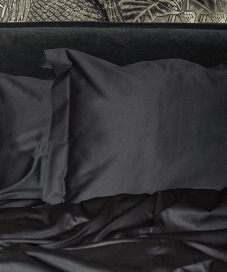 Tumšas grafīta krāsas satīna spilvendrāna, pieejama ar un bez dekoratīvi nošūtām maliņām. To var izmantot atsevišķi vai papildināt satīna gultas veļas komplektus.