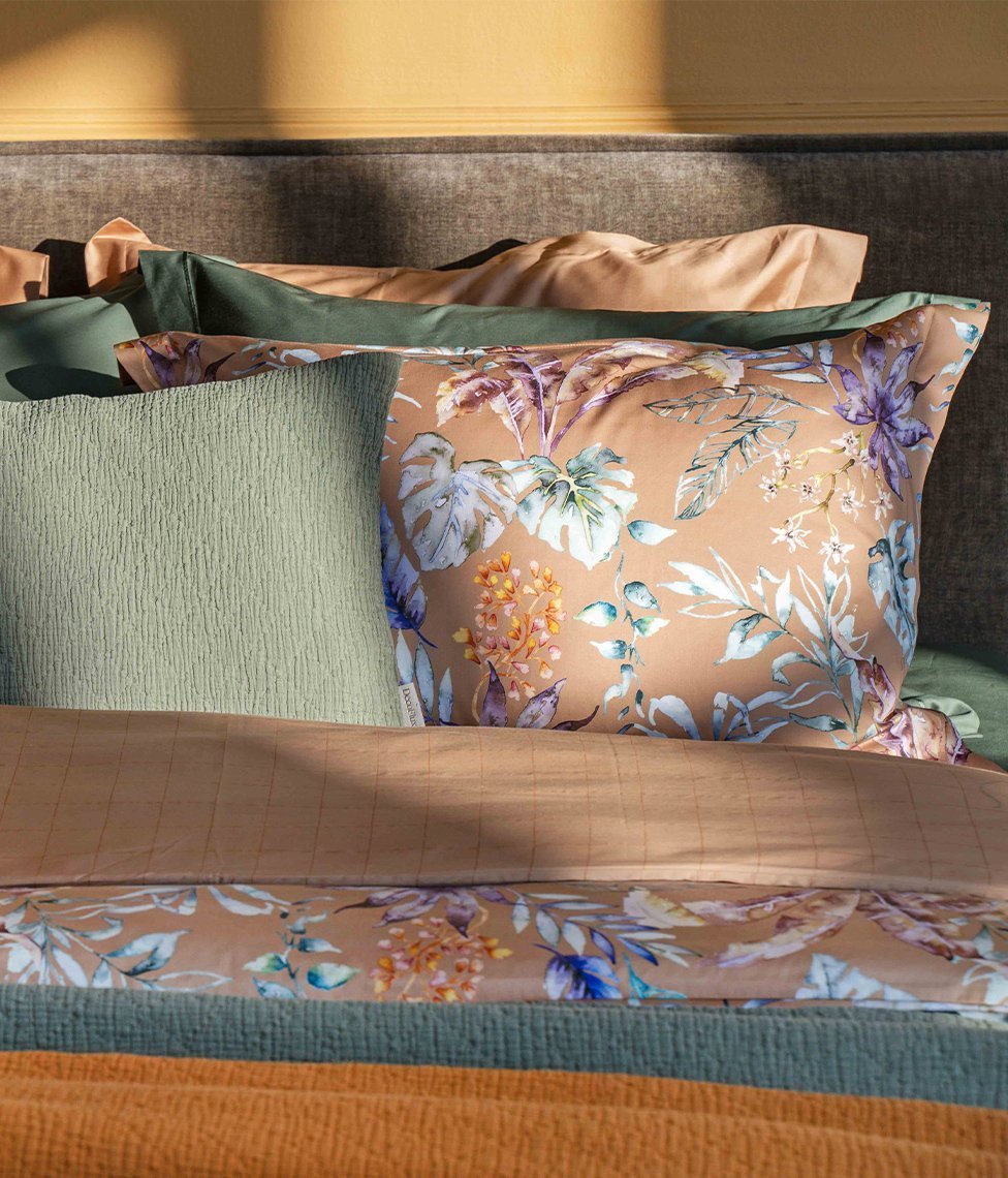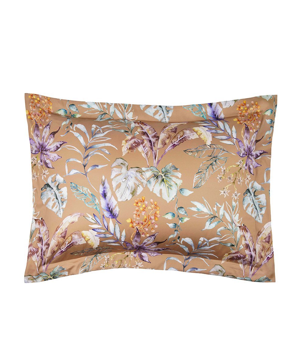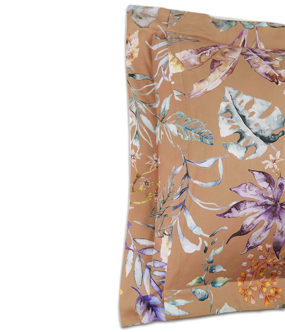Satīna spilvendrāna piesātināta kanēļa krāsā ar ziedu rakstu un dabas motīviem, pieejama ar un bez dekoratīvi nošūtām maliņām. To var izmantot atsevišķi vai papildināt satīna gultas veļas komplektus.