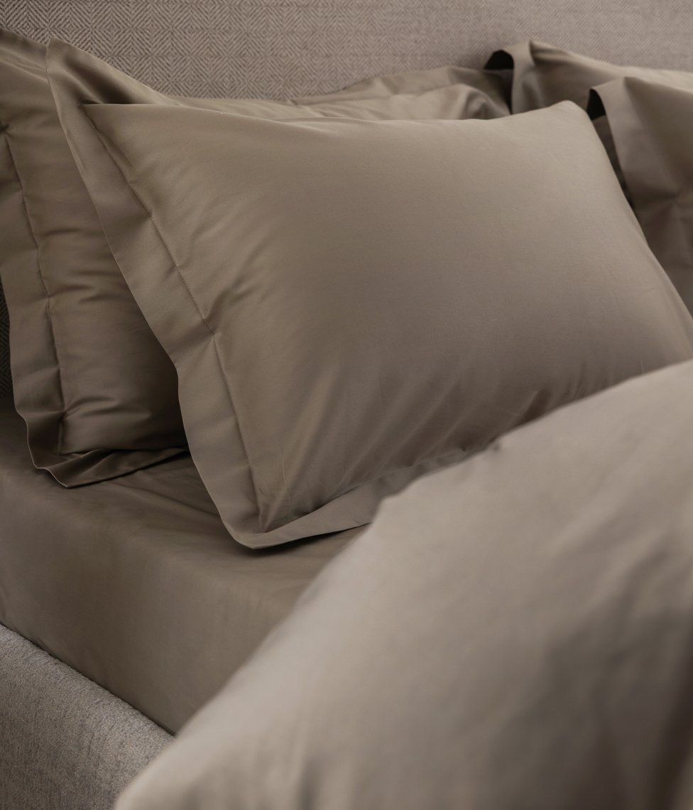 Pelēcīgi bēšas krāsas satīna spilvendrāna, pieejama ar un bez dekoratīvi nošūtām maliņām. To var izmantot atsevišķi vai papildināt satīna gultas veļas komplektus.