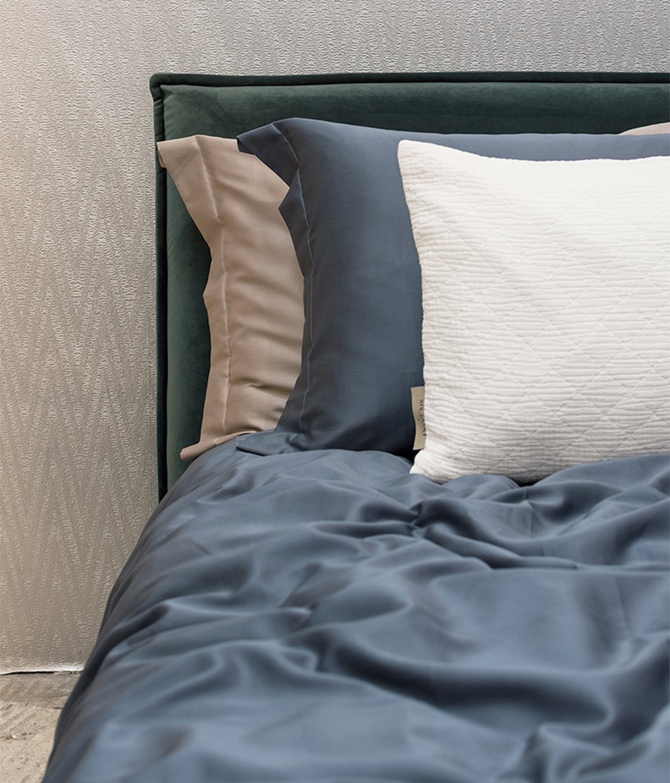 Dūmakaini zilas krāsas satīna spilvendrāna, pieejama ar un bez dekoratīvi nošūtām maliņām. To var izmantot atsevišķi vai papildināt satīna gultas veļas komplektus.