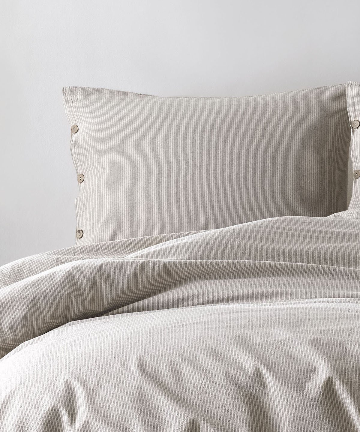 Kokvilnas gultas komplekts gaiši pelēcīgi bēšām un silti baltas krāsas svītrām, kas imitē tradicionālo svītraino kreklu rakstu. Palags ir vienkrāsains, gaiši pelēkā krāsā.