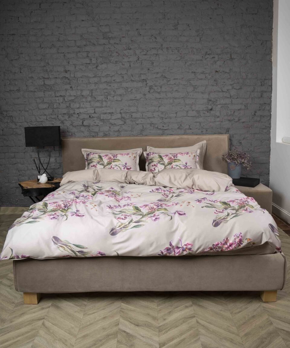 Komplekts bēšā krāsā ar elegantu orhideju ziedu rakstu radīs estētisku saskaņu ar jebkuru krāsu Jūsu guļamistabā. Viena puse segas pārvalkam ir ar rakstu, otra bēšā (Almond) krāsā. Šī gultas veļa lieliski piemērota mūsdienīgam vai klasiskam interjeram.