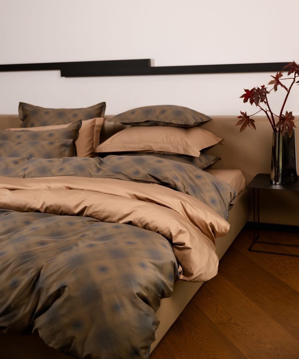 Komplekta Mirage Gold dizains smalki apvieno ilūzijas un realitātes saspēli. Līdzīgi kā mirāža, tumši zili pelēcīgas līnijas saplūst uz zeltaina fona, radot smalku rūtainu rakstu. No pirmā acu uzmetiena vienkāršs, bet, rūpīgāk aplūkojot, pastāvīgi mainīgs, šis raksts valdzina ar savu noslēpumainību un eleganci. Savukārt augstas kvalitātes kokvilnas satīna audums nodrošina izcilu maigumu un smalku spīdumu. Abas puses vienādas – ar rakstu.